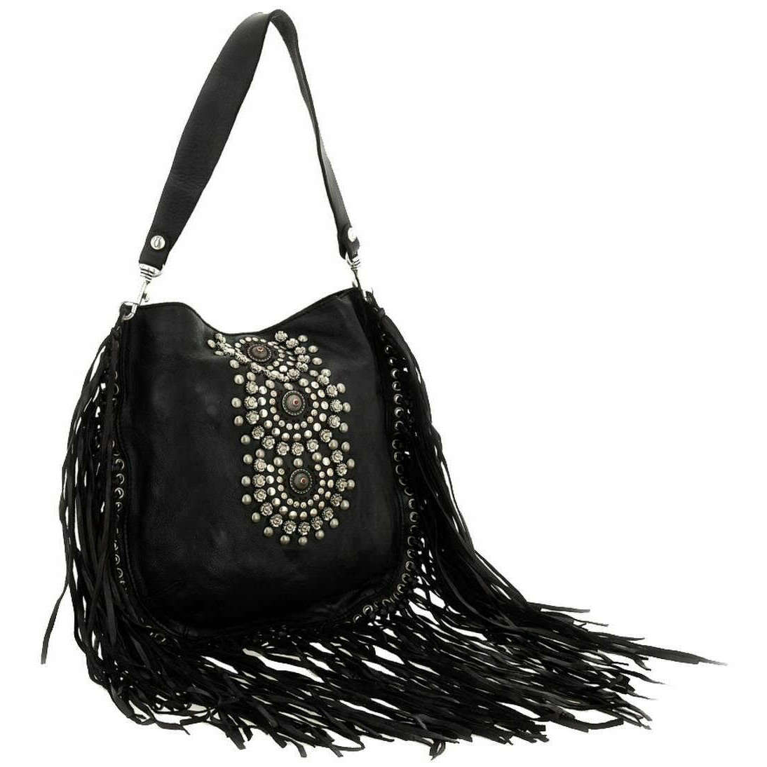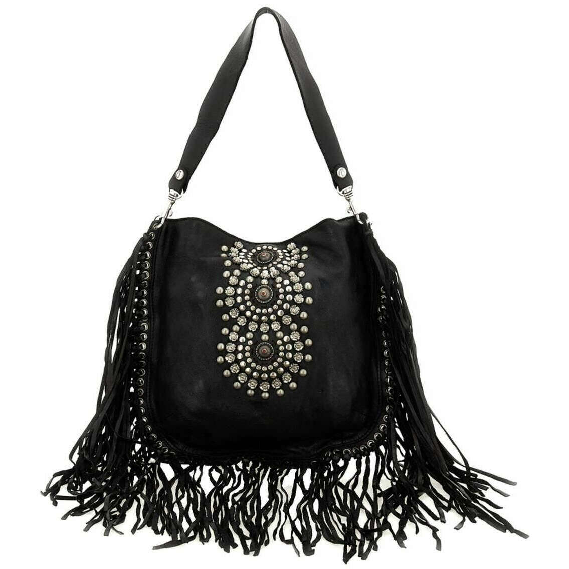 Realizzata al 100% in pelle di vacchetta è questa borsa a tracolla Camelia da donna nera del designer Campomaggi. Misura 30 cm (altezza) x 30 cm (larghezza) x 0,5 cm (profondità). Campomaggi ha realizzato questa borsa a tracolla Camelia in Italia. Si consiglia di spazzolare con un panno umido ed evitare l'uso di detergenti per mantenere questa borsa in buone condizioni. Tutte le borse sono complete di confezione campomaggi. La borsa a tracolla Camelia Campomaggi - Nera è una borsa indispensabile per tutti i giorni che aggiunge lusso e un look divertente al tuo abbigliamento. Caratterizzato da nappe e strass aggiunge un tocco elegante e femminile, mentre la tracolla staccabile e la tracolla regolabile staccabile aggiungono versatilità a seconda dell'occasione. Lo scomparto principale offre ampio spazio di archiviazione assicurandoti di avere con te i tuoi oggetti essenziali. Realizzato in pelle di prima qualità, presenta un bellissimo colore di ispirazione vintage ottenuto attraverso la concia al vegetale, un processo tradizionale che utilizza ingredienti naturali per una finitura ricca.