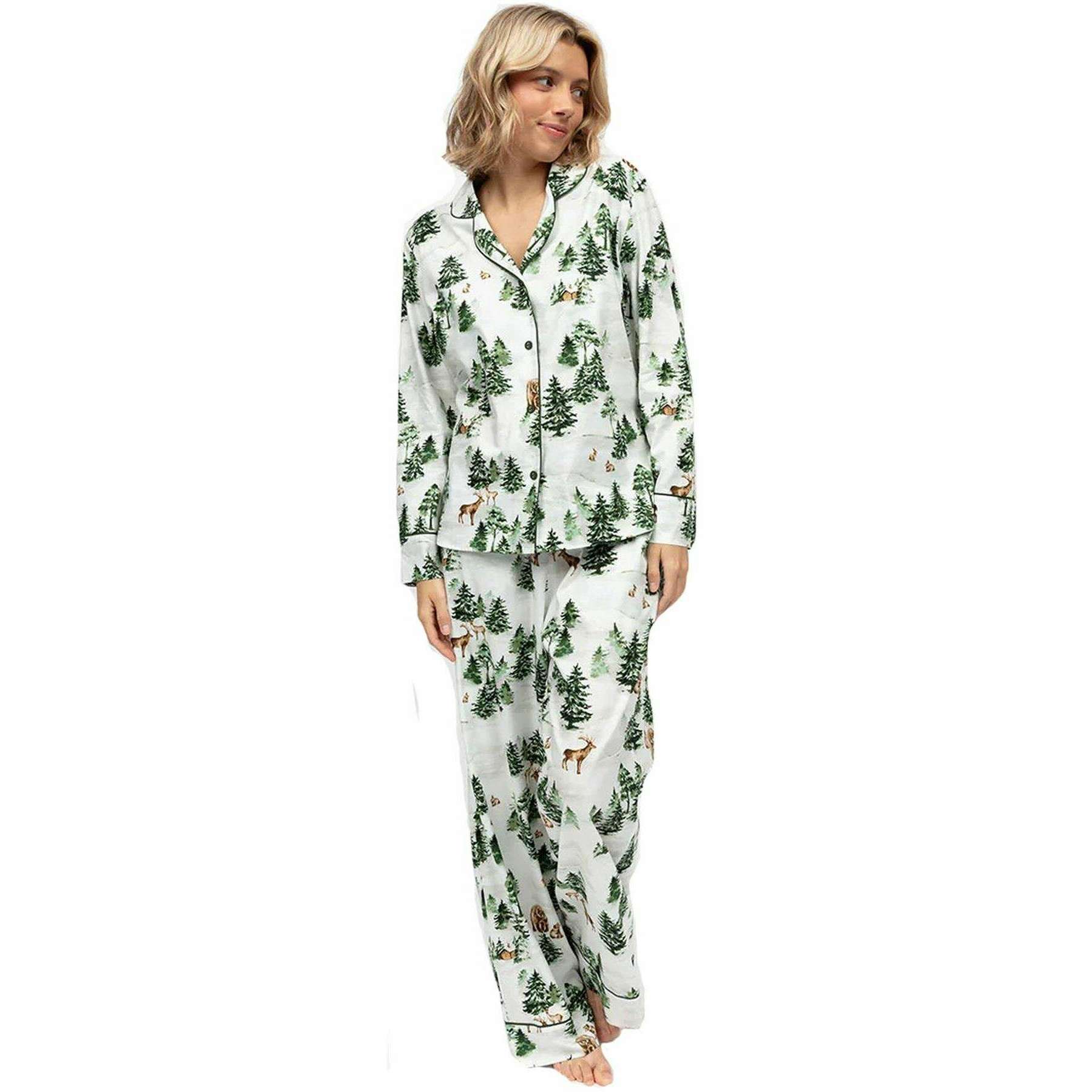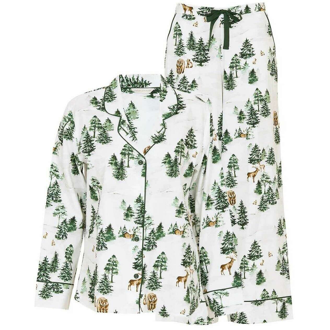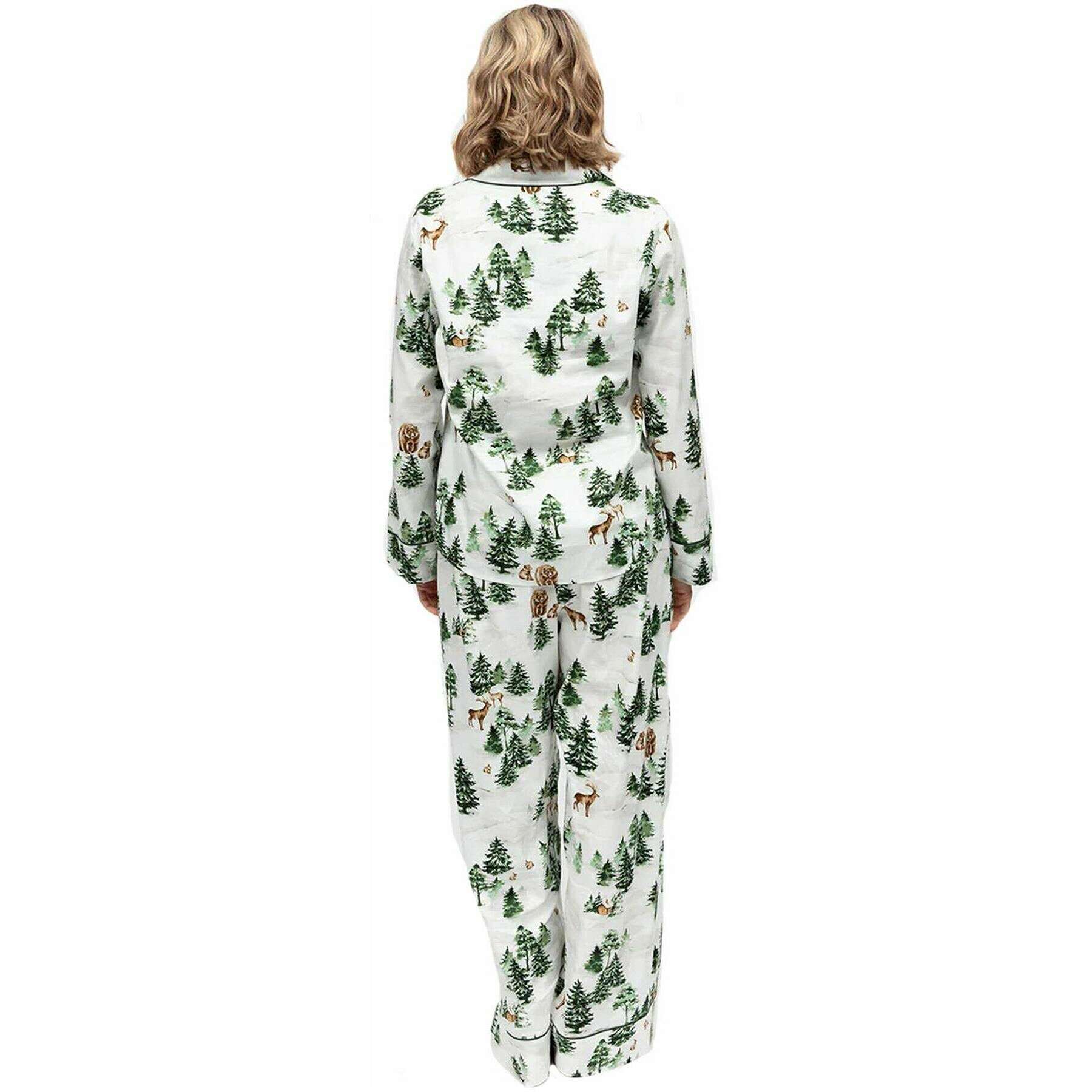 Questo pigiama da donna in jersey con stampa felce alpina del marchio Cyberjammies è realizzato al 60% in cotone e al 40% in modal e è presentato in verde. Anche il pigiama verde oliva/bianco è disegnato con un motivo floreale. Si consiglia di lavare in lavatrice al rovescio, non immergere, lavare con colori simili per mantenere questo pigiama in buone condizioni. Tutti i pigiami sono completi di etichette cyberjammies. Il set pigiama Cyberjammies Fern Alpine Print Jersey - Verde oliva/Bianco regala piacevoli vibrazioni invernali ai tuoi tempi di inattività. Realizzato in morbido misto cotone e modal, questo set presenta una serena stampa alpina di pini, baite e animali del bosco su uno sfondo bianco frizzante. La parte superiore include un colletto con risvolto, profili verde oliva e bottoni ricoperti per una finitura su misura, mentre i pantaloni a gamba larga offrono una parte posteriore elasticizzata, parte anteriore piatta, coulisse regolabile e tasche laterali per comfort e facilità. Perfetto per mattine festive o serate rilassate, questo set combina il fascino stagionale con il lusso quotidiano.