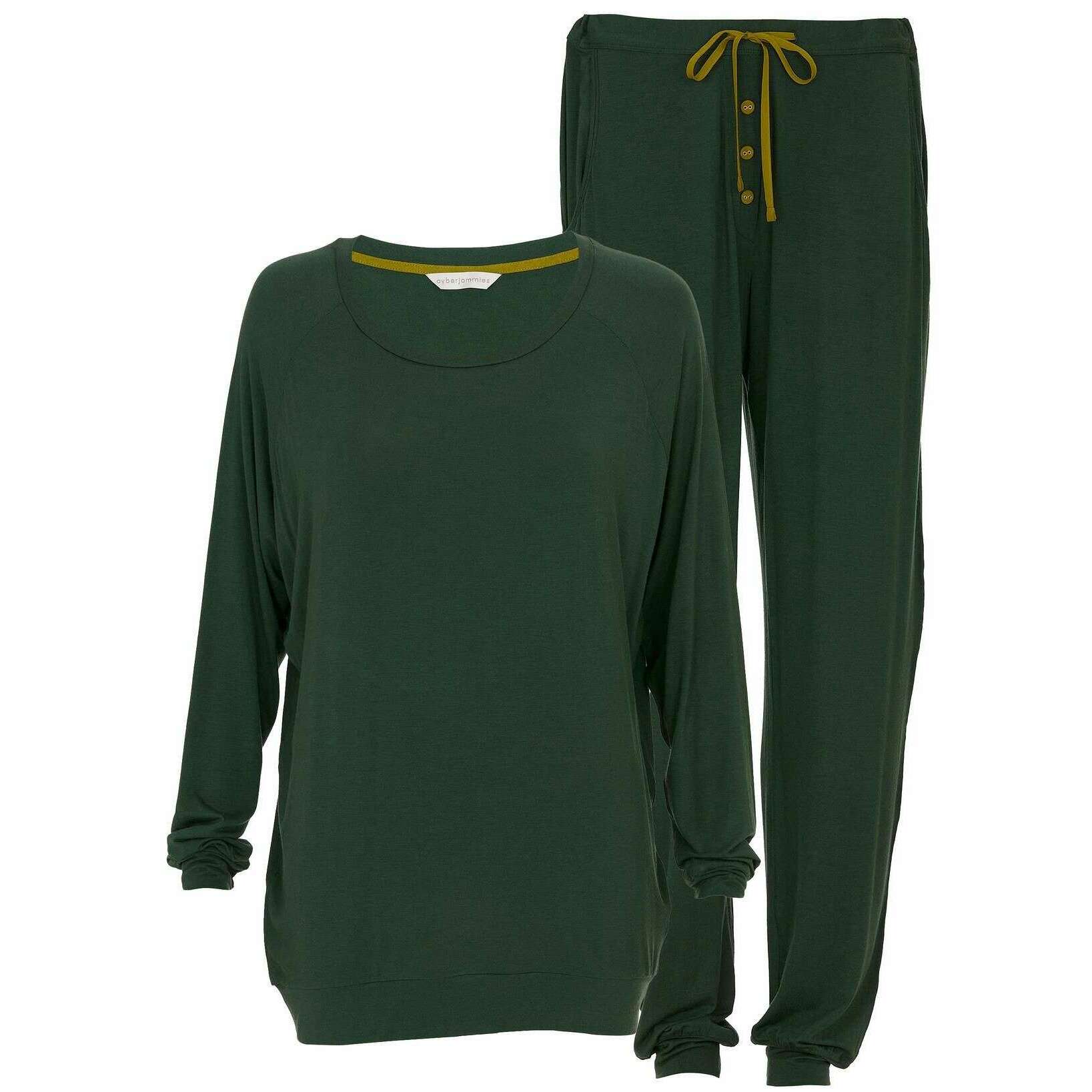 Questo pigiama da donna in jersey morbido verde oliva del marchio Cyberjammies è realizzato al 95% in modal e al 5% in elastan e è presentato in verde. Anche il pigiama verde oliva è disegnato in tinta unita. Si consiglia di lavare in lavatrice al rovescio, non immergere, lavare con colori simili per mantenere questo pigiama in buone condizioni. Tutti i pigiami sono completi di etichette cyberjammies. Il set pigiama Cyberjammies Olive Slouch Jersey - Verde oliva renderà quei momenti comodi ancora più comodi. Indossa questo pigiama semplicemente stupendo, ampio ma non troppo largo ogni volta che ti rilassi a casa e goditi il ​​materiale morbido ed elasticizzato e abbraccialo come una seconda pelle. I pantaloni sono dotati di vita elasticizzata con bottoni piatti e coulisse regolabile per garantire un comfort assoluto. Progettati con cura per notti riposanti e mattine rilassate, i pigiami Jersey Slouch diventeranno un punto fermo della tua collezione.