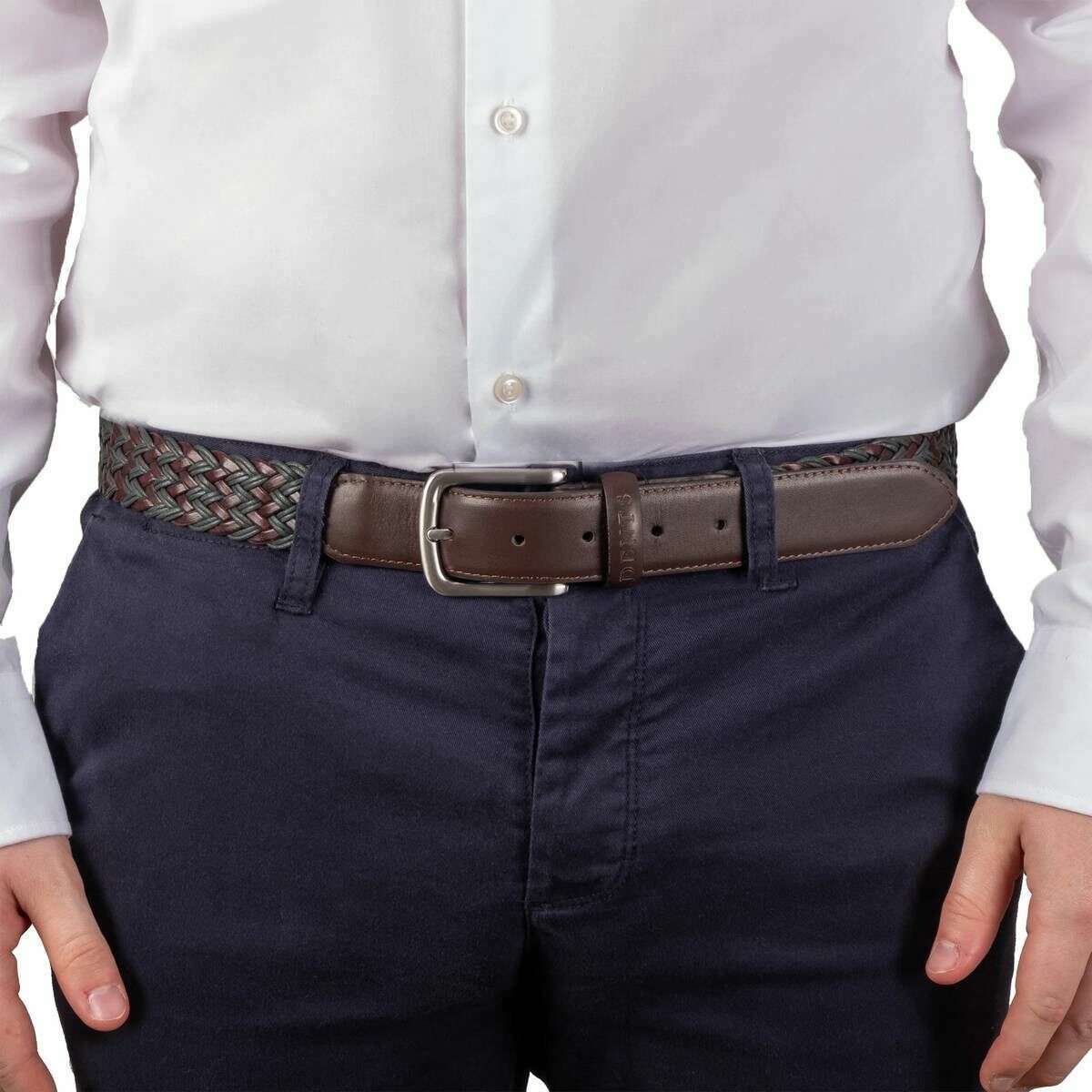 • Intrecciato , Estremità in pelle , Fibbia quadrata , Passante singolo in pelle , Goffrato , 5 fori , Larghezza 3,5 cm