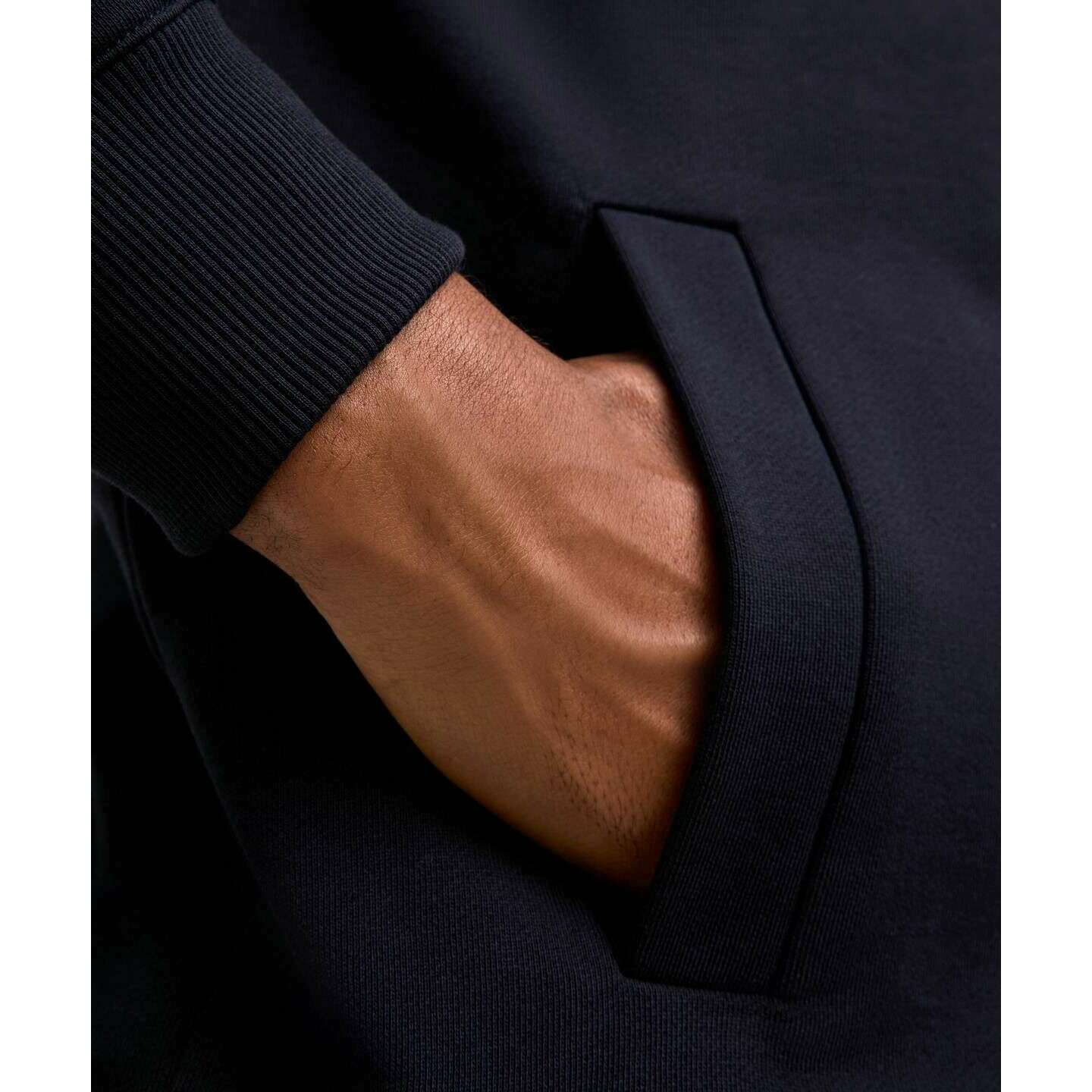 • Cotone biologico certificato, peso medio, interno con trama ad anello, vestibilità classica, polsini a coste elasticizzati, tasche laterali