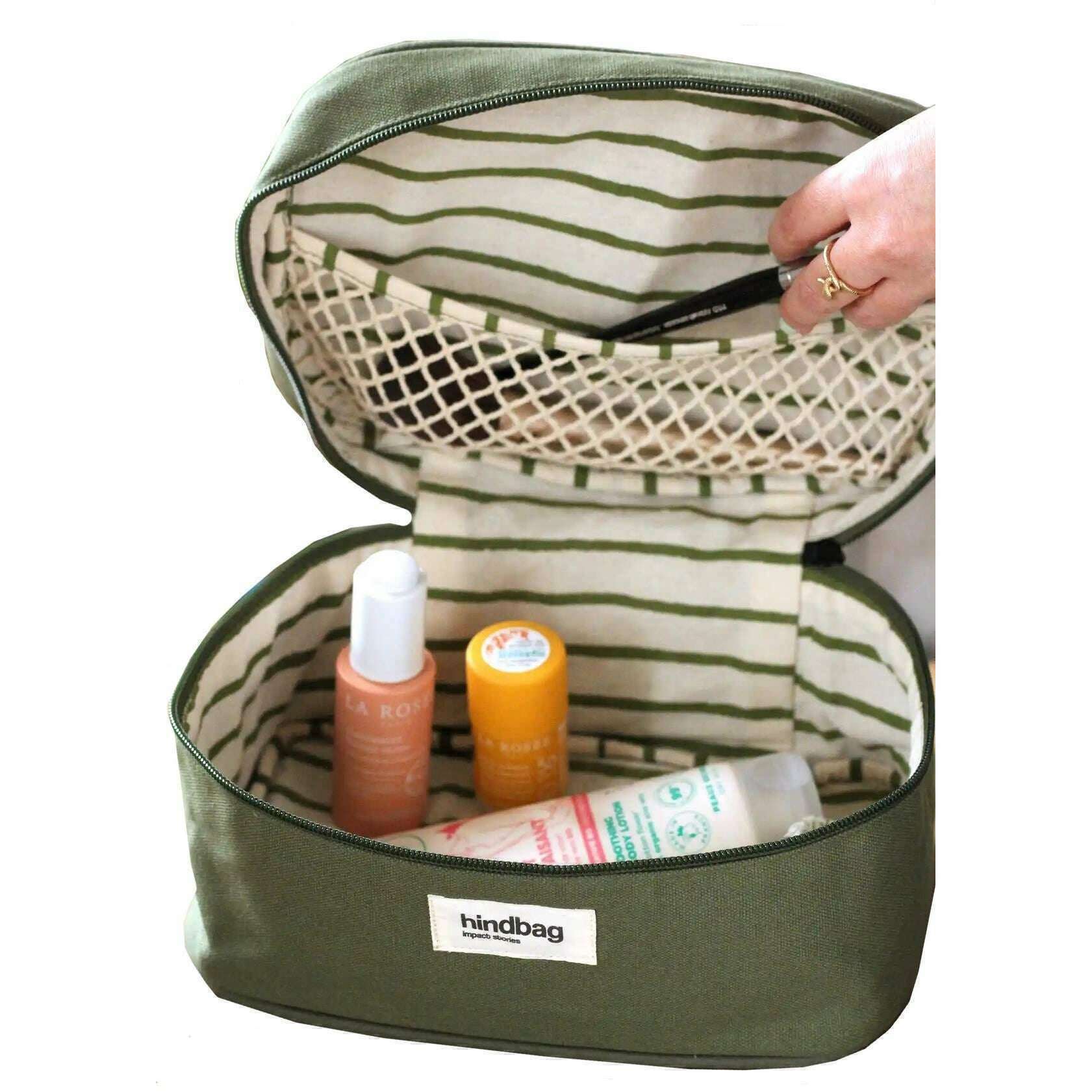 Questa borsa di vanità Gaspard unisex è stata realizzata con cotone organico al 100%, presente in un colore verde ed è del marchio Hindbag. Misura 13,5 cm (altezza) x 16 cm (larghezza) x 25 cm (profondità). Tutte le borse sono complete di imballaggi hindbag. The Hindbag Gaspard Vanity Bag - Olive Green offre ai viaggiatori e agli utenti quotidiani allo stesso modo un modo comodo ed elegante per mantenere i loro articoli da toeletta organizzati e accessibili. La rete interna è perfetta per organizzare ordinatamente articoli da toeletta, cosmetici e altri oggetti personali. Disponibile in una vasta gamma di colori, questo accessorio alla moda rappresenta una fusione armoniosa di funzionalità e estetica, soddisfacendo coloro che apprezzano sia lo stile che la praticità nel loro viaggio.
