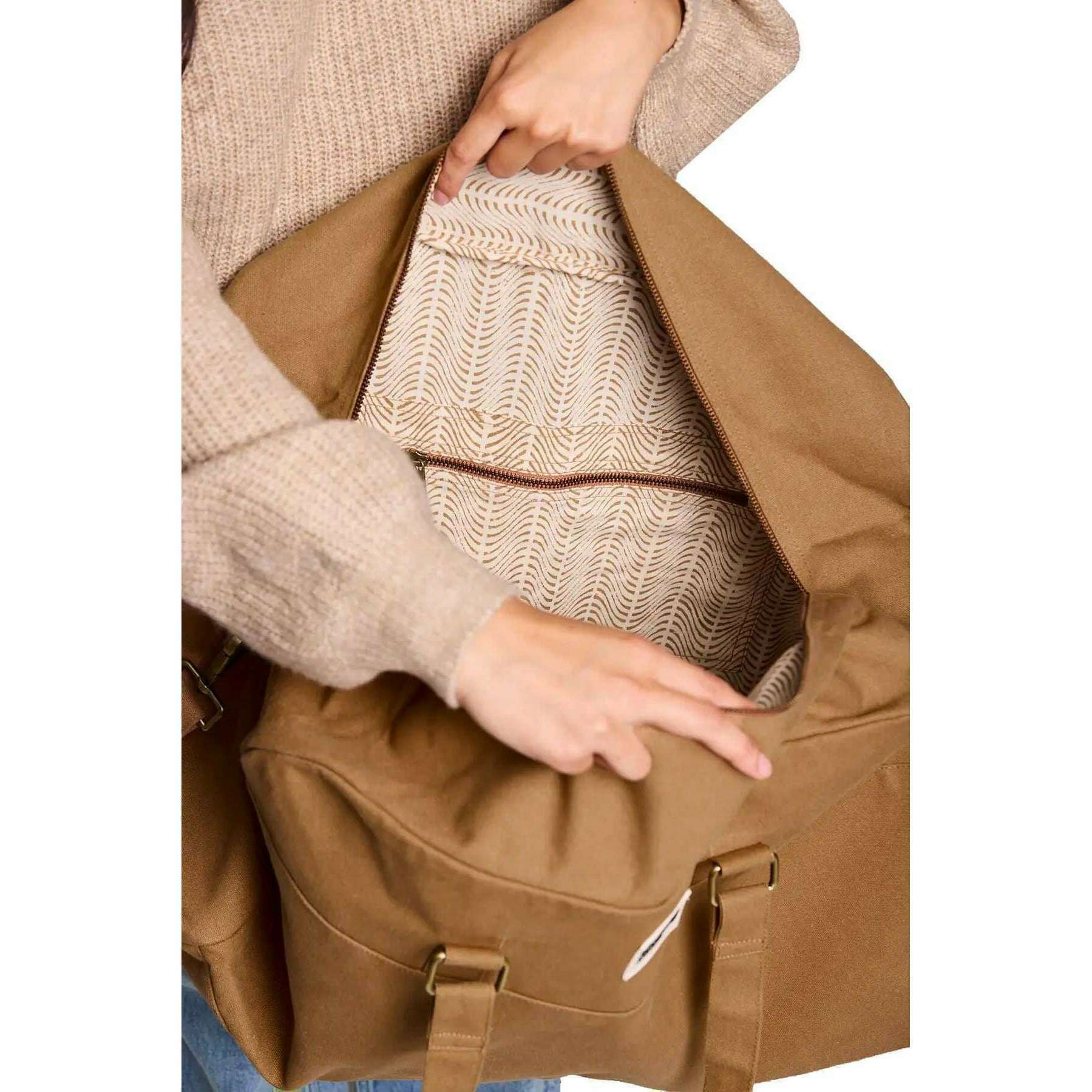Il designer Hindbag ti ha portato questa borsa di cotone biologica unisex al 100% con toni marroni alla cannella. Misura 33 cm (altezza) x 54 cm (larghezza) x 24 cm (profondità). Tutte le borse sono complete di imballaggi hindbag. La grande borsa da viaggio Hindbag Yves - Cinnamon Brown è un'opzione spaziosa ed ecologica per i viaggiatori. Realizzata da fitto cotone organico certificato GOTS, questa borsa dispone di tasche multiple per l'organizzazione, una chiusura di cerniera sicura e una fodera interna stampata che aggiunge un tocco di eleganza. Con le maniglie e la tracolla di grandi dimensioni regolabili, questa borsa può essere facilmente trasportata a mano o sulla spalla.