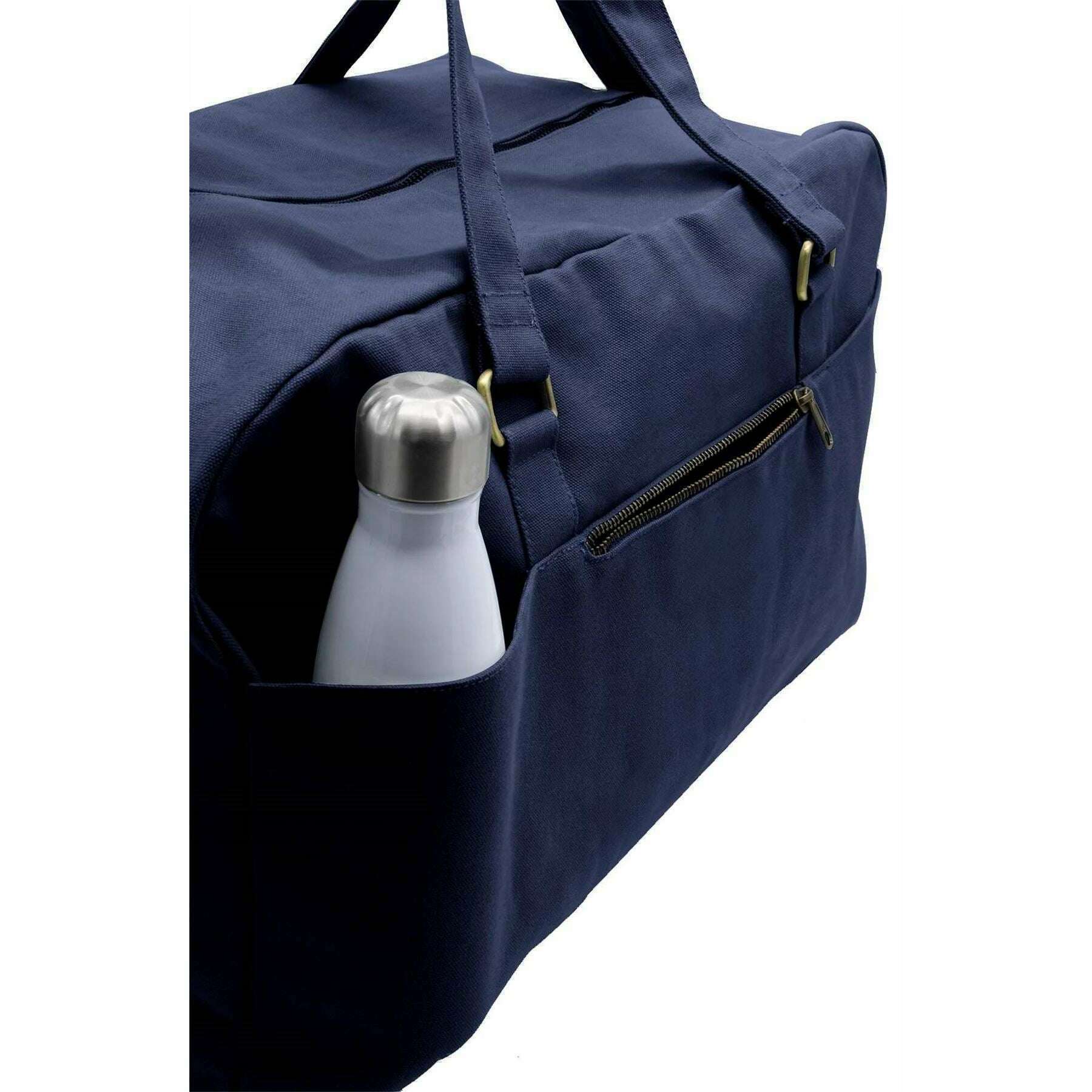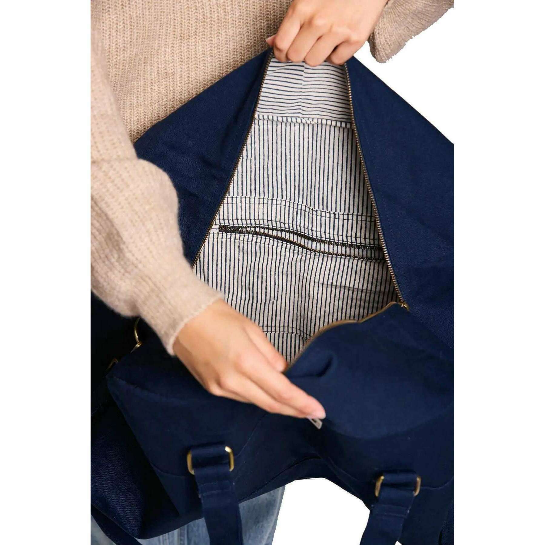 Questa grande borsa da viaggio Yves per uomini o donne è modellata dal marchio Hindbag di colore blu ed è realizzato in cotone biologico al 100%. Misura 33 cm (altezza) x 54 cm (larghezza) x 24 cm (profondità). Tutte le borse sono complete di imballaggi hindbag. La grande borsa da viaggio Hindbag Yves - Navy Blue è un'opzione spaziosa ed ecologica per i viaggiatori. Realizzata da fitto cotone organico certificato GOTS, questa borsa dispone di tasche multiple per l'organizzazione, una chiusura di cerniera sicura e una fodera interna stampata che aggiunge un tocco di eleganza. Con le maniglie e la tracolla di grandi dimensioni regolabili, questa borsa può essere facilmente trasportata a mano o sulla spalla.