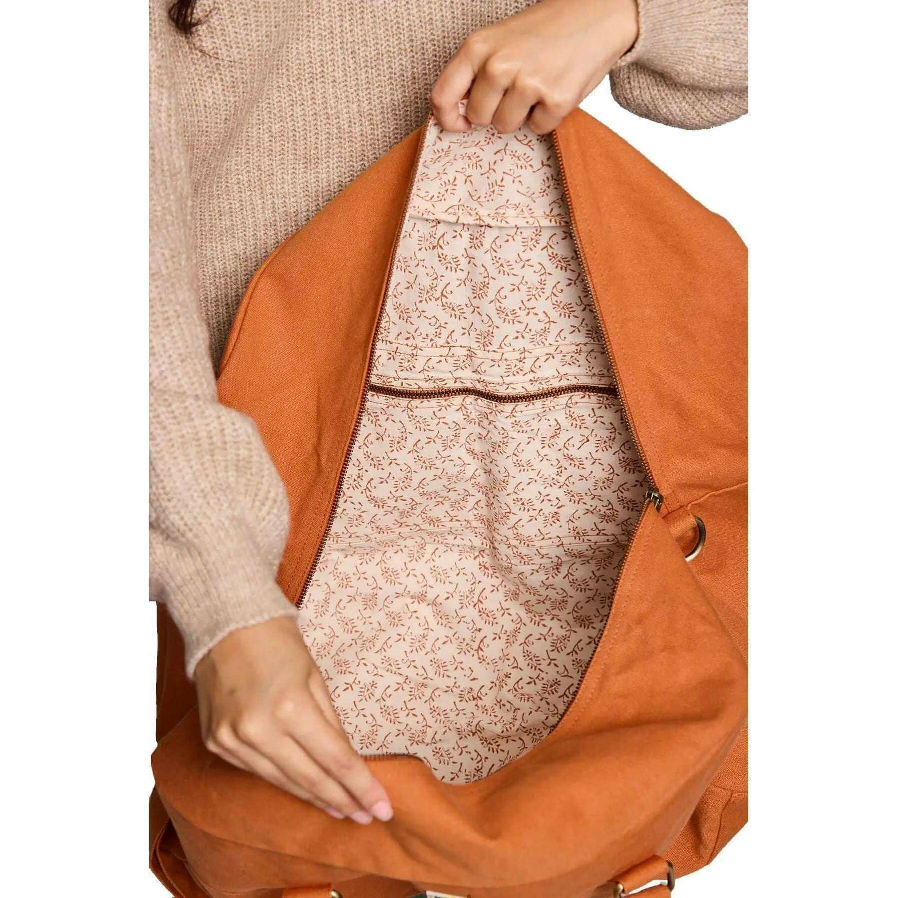 Perfetto per uomini o donne è questa grande borsa da viaggio Sienna Orange Yves Hindbag, è anche realizzata con cotone organico al 100%. Misura 33 cm (altezza) x 54 cm (larghezza) x 24 cm (profondità). Tutte le borse sono complete di imballaggi hindbag. La grande borsa da viaggio Hindbag Yves - Sienna Orange è un'opzione spaziosa ed ecologica per i viaggiatori. Realizzata da fitto cotone organico certificato GOTS, questa borsa dispone di tasche multiple per l'organizzazione, una chiusura di cerniera sicura e una fodera interna stampata che aggiunge un tocco di eleganza. Con le maniglie e la tracolla di grandi dimensioni regolabili, questa borsa può essere facilmente trasportata a mano o sulla spalla.