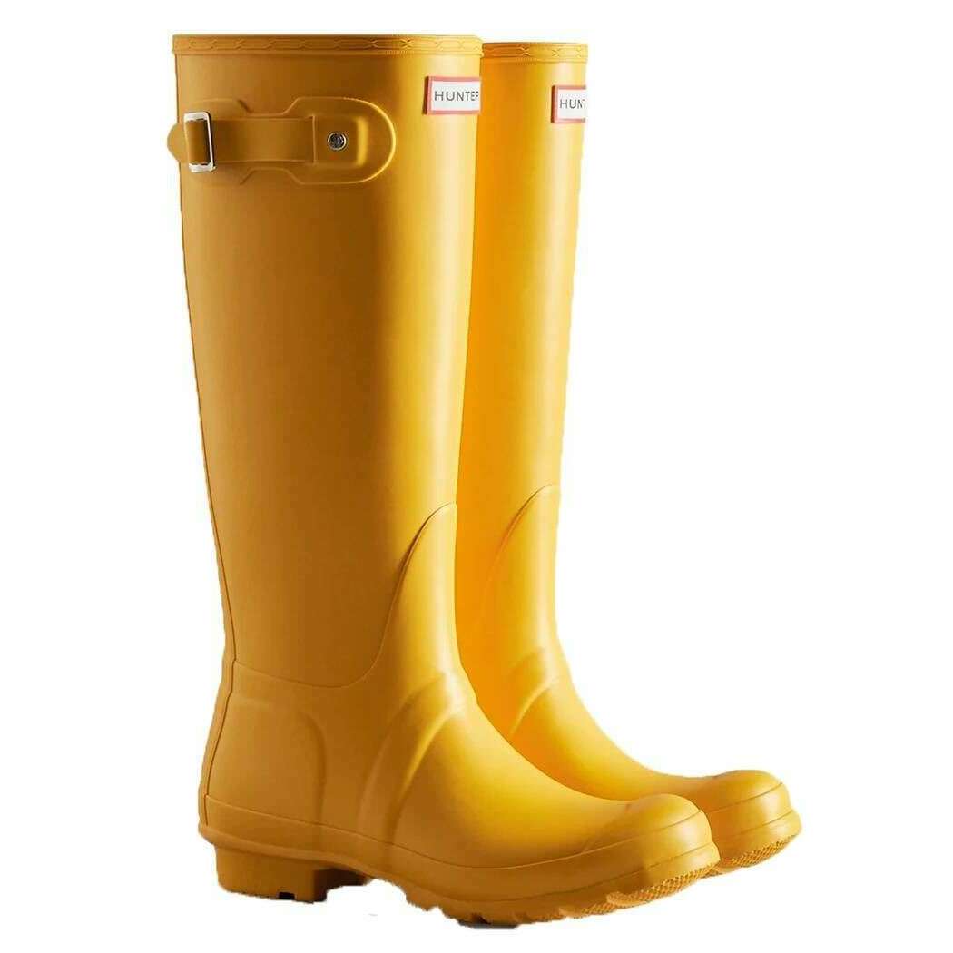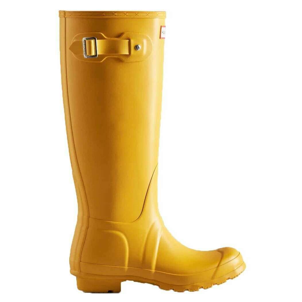 Questi stivali Wellington alti originali da donna sono stati realizzati al 100% in gomma, sono di colore giallo e provengono dal marchio Hunter. Tutti gli stivali Wellington sono completi di confezione da cacciatore. Gli stivali Wellington alti originali Hunter - Giallo sono uno stile fondamentale della collezione Hunter e offrono una protezione affidabile sin dalla loro introduzione nel 1956. Ogni paio è realizzato artigianalmente con 28 parti in gomma naturale tagliate a mano, assemblate in tre giorni su una forma in alluminio su misura e vulcanizzata per prestazioni di impermeabilità superiori. Progettato con una finitura opaca, lo stivale include il disegno del battistrada Hunter Original insieme a una fodera e un sottopiede aggiornati in poliestere riciclato per un maggiore comfort. Appositamente progettato per respingere l'acqua e prevenire la penetrazione dell'umidità, questo stivale vegano certificato è una scelta essenziale per l'abbigliamento in caso di pioggia.