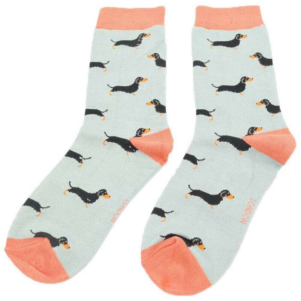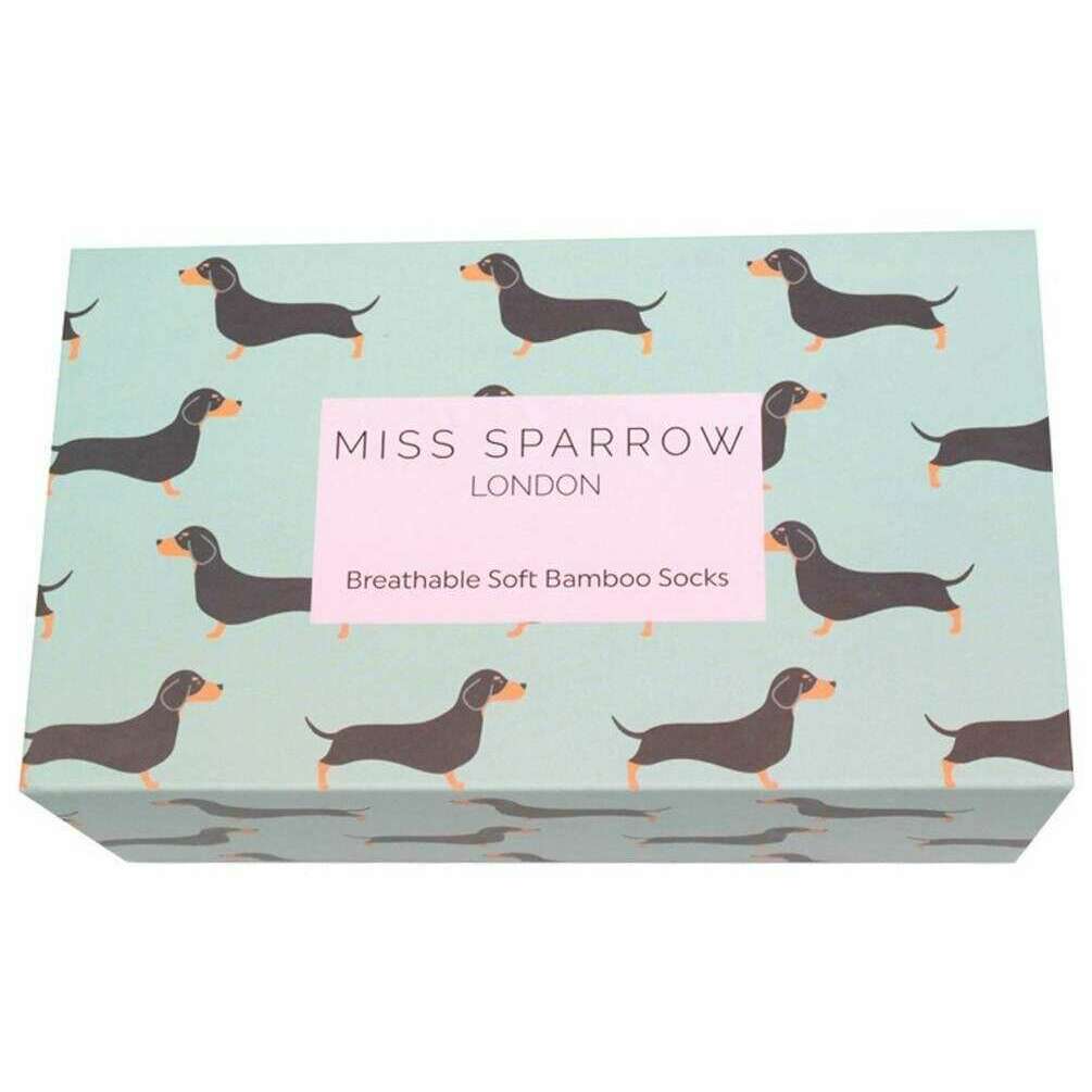 Miss Sparrow London Confezione da 3 scatole di calzini Little Sausage Dogs - Blu/Verde/Giallo