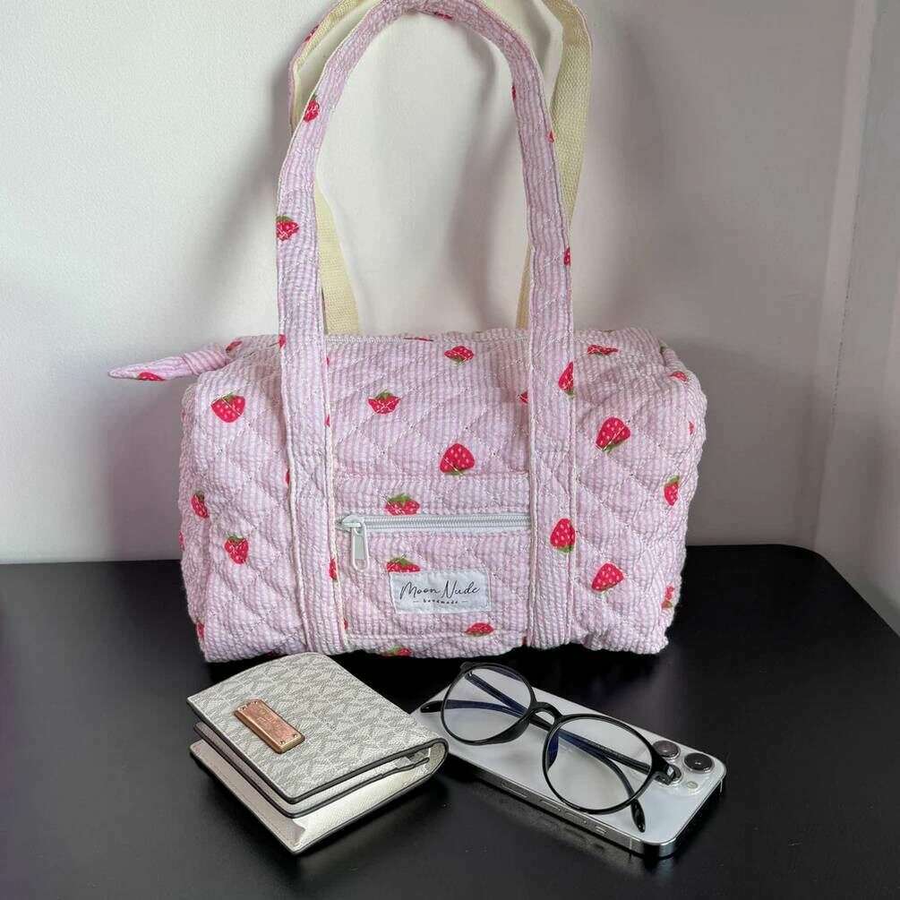 Questo mini borsone da donna fragola del marchio Moon Nude è realizzato al 100% in cotone ed è presentato in rosa. Misura 18 cm (altezza) x 31 cm (larghezza) x 18 cm (profondità). Si consiglia di lavare a mano in acqua fredda con un detersivo delicato o di lavare al rovescio con un ciclo delicato. per mantenere questa borsa in buone condizioni. Tutte le borse sono complete di confezione color nude lunare. Il mini borsone Moon Nude Strawberry - Rosa/Rosso presenta un bellissimo design trapuntato fatto a mano. Questa borsa presenta una tasca esterna con cerniera, un interno spazioso e due grandi manici, perfetti per una borsa casual per uscire o come regalo.