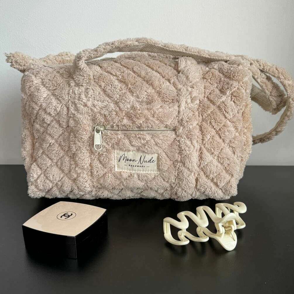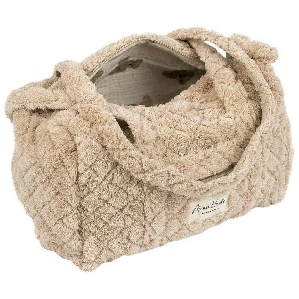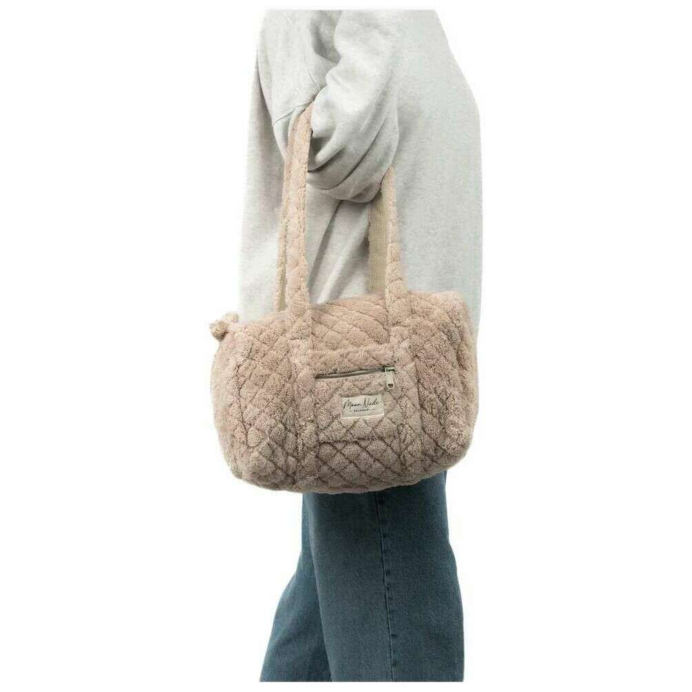 Perfetto per le donne è questo mini borsone in orsacchiotto beige Moon Nude, anch'esso realizzato al 100% in cotone. Misura 18 cm (altezza) x 31 cm (larghezza) x 18 cm (profondità). Si consiglia di lavare a mano in acqua fredda con un detersivo delicato o di lavare al rovescio con un ciclo delicato. per mantenere questa borsa in buone condizioni. Tutte le borse sono complete di confezione color nude lunare. Il mini borsone Moon Nude Teddy - Beige presenta un bellissimo design trapuntato fatto a mano. Questa borsa presenta una tasca esterna con cerniera, un interno spazioso e due grandi manici, perfetti per una borsa casual per uscire o come regalo.