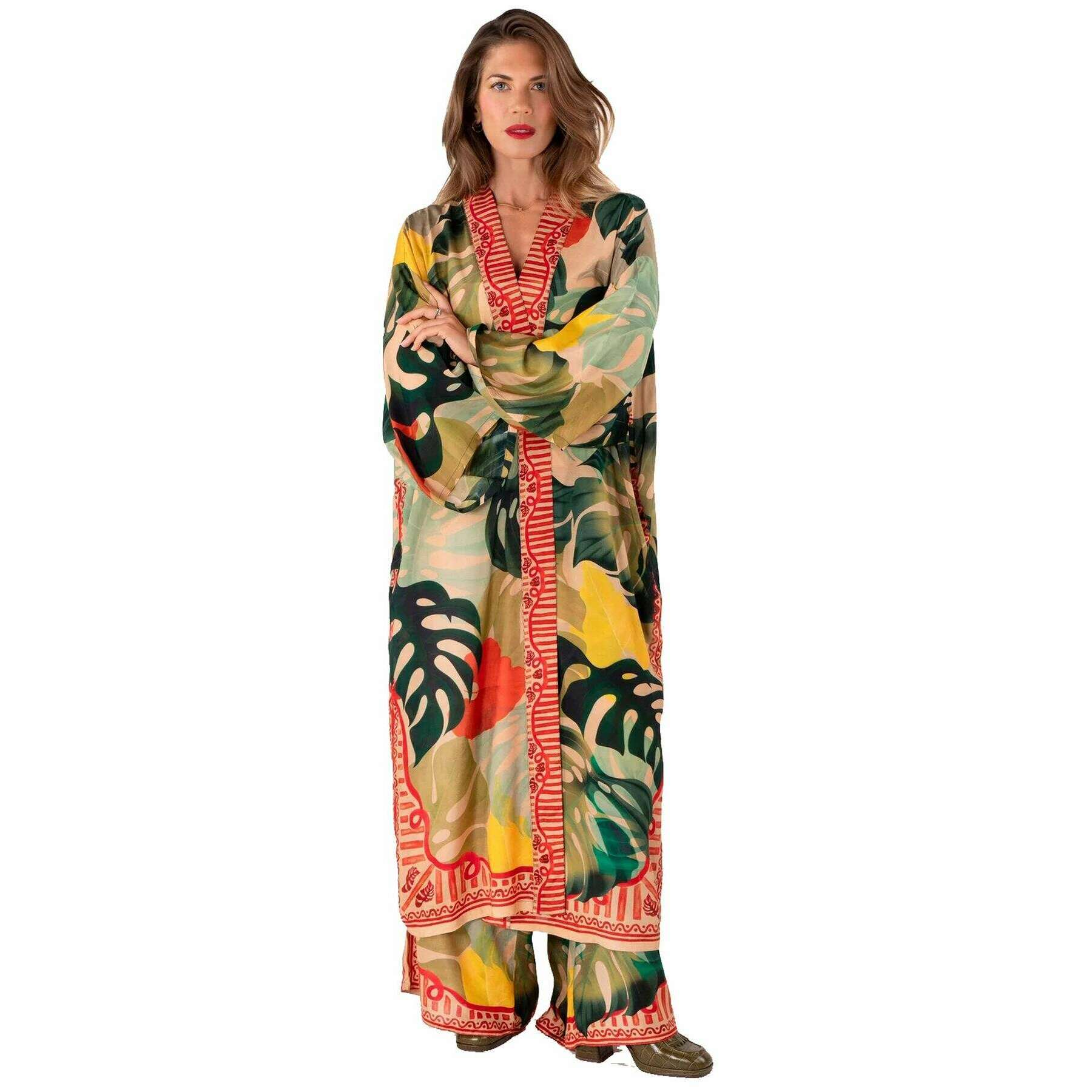 Abito kimono con foglie esotiche in polvere - Verde/Beige/Giallo