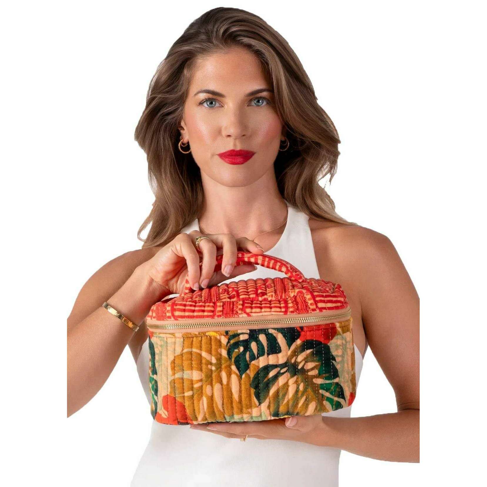 Beauty case trapuntato con foglie esotiche in polvere - Rosso/Verde/Beige