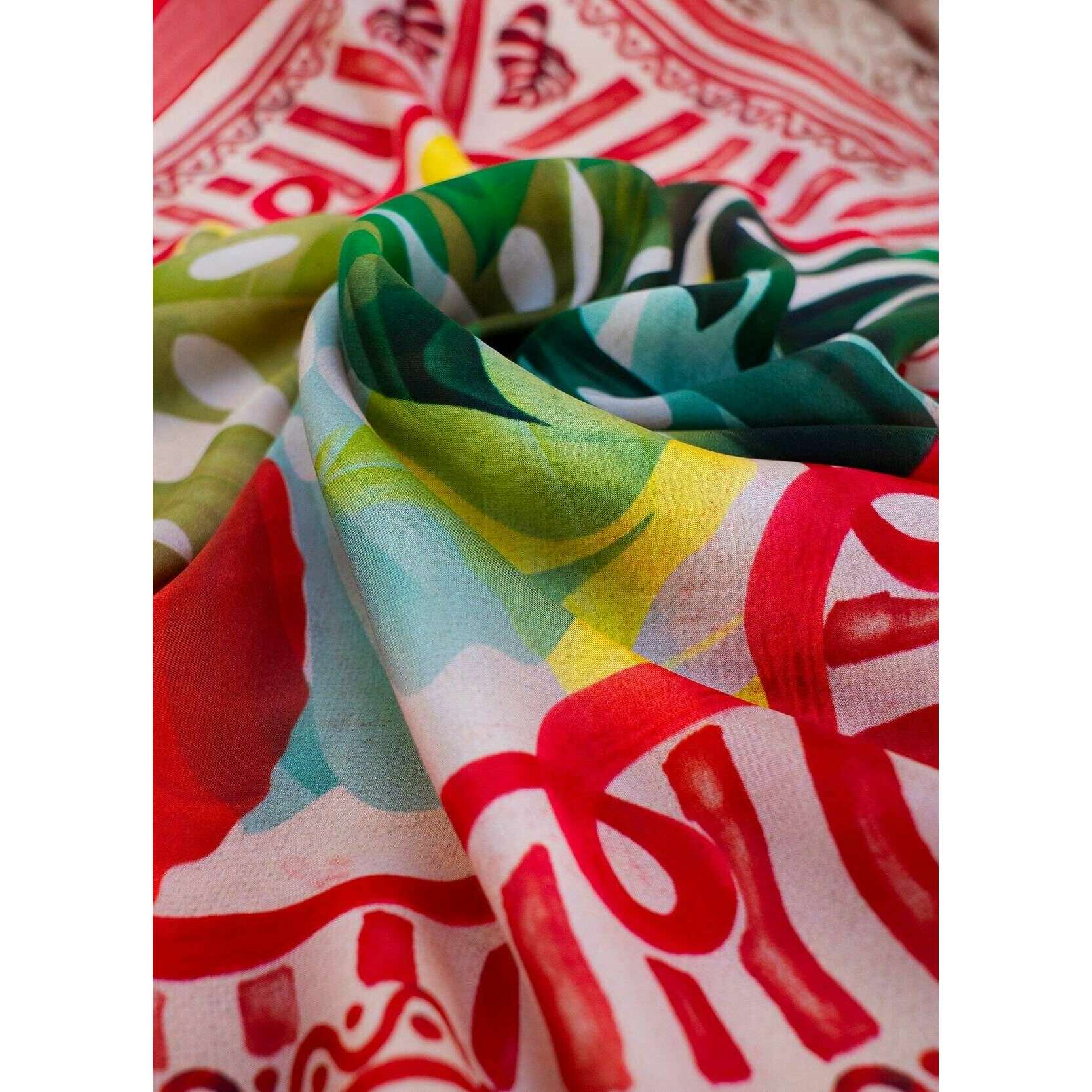 Sciarpa quadrata in seta con foglie esotiche in polvere - Rosso/Beige/Verde