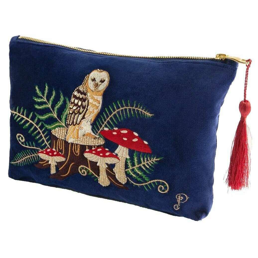 Designer Powder ti ha portato la borsa in velluto in poliestere al 100% femminile usando i toni della marina. Misura 21 cm (altezza) x 30 cm (larghezza). Tutte le borse sono complete di etichette in polvere. La tasca con zip in velluto in velluto a gufo di boschi in polvere - la marina può essere utilizzata per una varietà di scopi come, per conservare il trucco, la cura della pelle o gli articoli da toeletta. È dotato di una chiusura top zippata decorata con una bellissima nappe attaccata alla cerniera, dandogli un aspetto senza tempo. Per finire e, naturalmente, lo spettacolo è il design ricamato elegante e sbalorditivo sul davanti che può essere ammirato continuamente. Questa custodia con zip sarebbe il regalo perfetto.