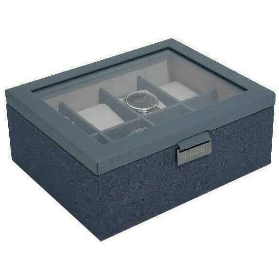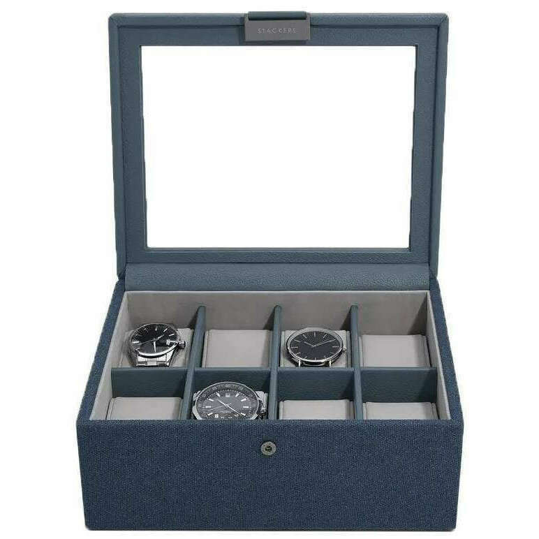 Offerto da The Brand Stackers, questa scatola di tela da 8 pezzi di tela da uomo blu è realizzata in pelle finta e tela. Misura 26 cm (altezza) x 19 cm (larghezza) x 9,8 cm (profondità). Tutte le scatole dei gentiluomini sono complete nella confezione di Stacker. La scatola di orologi da 8 pezzi di Stackers Canvas - Blue è ideale per mantenere tutti gli orologi in un unico posto e esposti all'interno di una scatola intelligente che impedisce loro di raccogliere polvere in un cassetto quando non vengono indossati. Ognuno dei tuoi orologi può essere legato a un piccolo cuscino per una presentazione attraente. Un must per la collezione di qualsiasi gentiluomo.