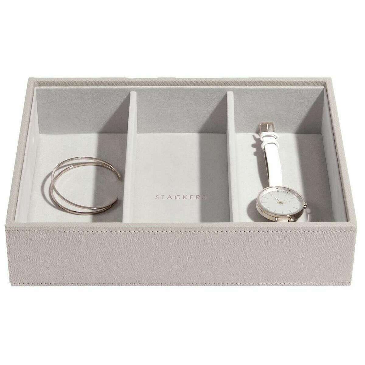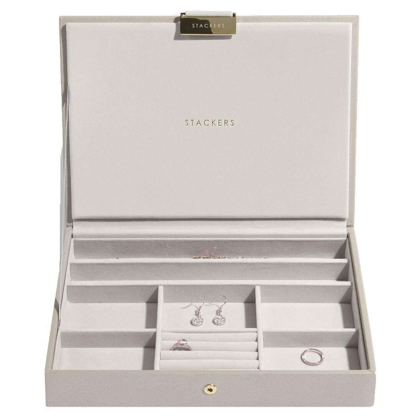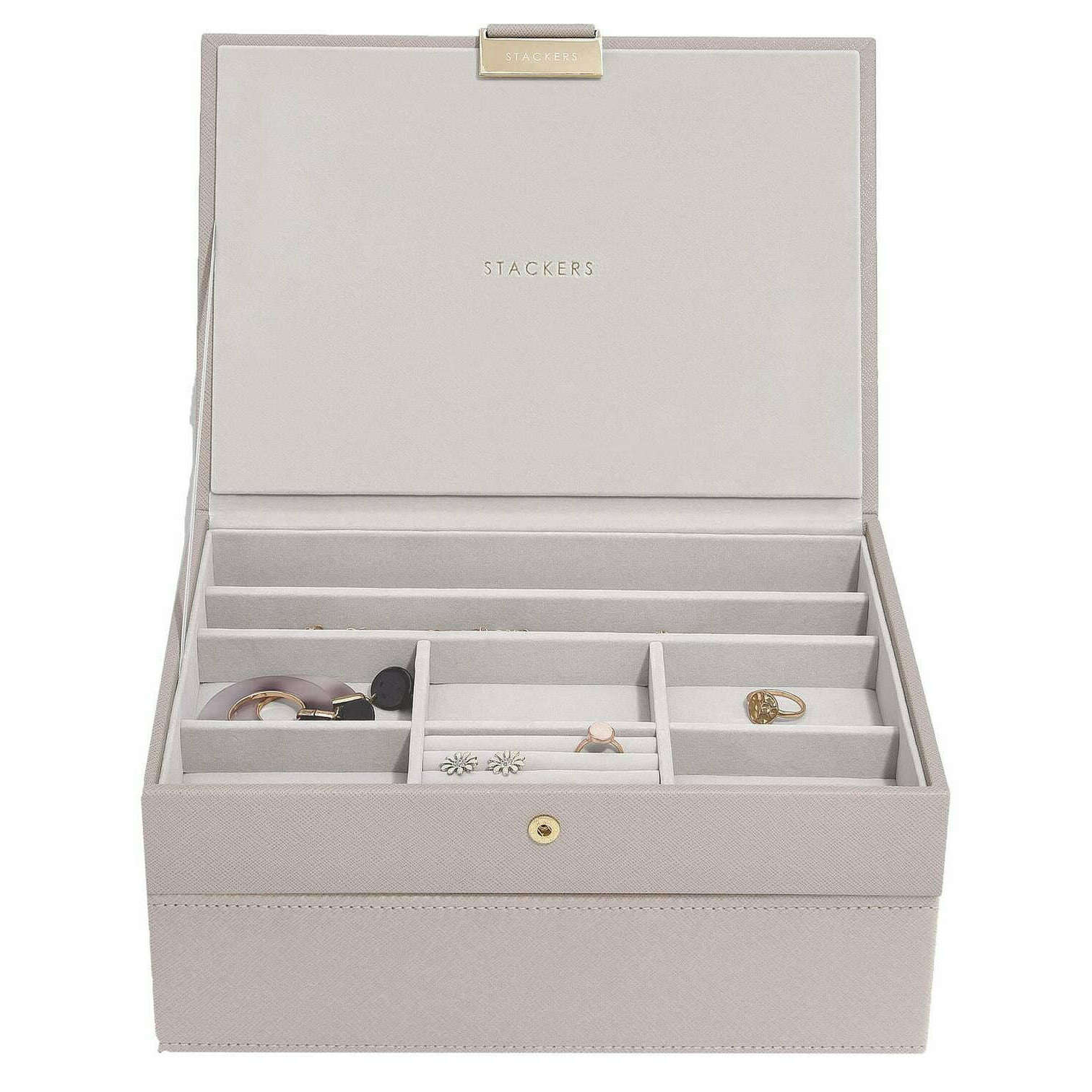 Realizzato in ecopelle e velluto, questo classico set di 2 portagioie da donna in rafia color talpa del designer Stackers. Misura 11 cm (altezza) x 25 cm (larghezza) x 18 cm (profondità). Tutti gli astucci per gioielli sono completi di confezione impilabile. Il set classico di 2 portagioie Stackers - Rafia color talpa presenta un design unico del portagioie in rafia color talpa. Questo portagioielli è perfetto per riporre tutti i tuoi gioielli! Viene fornito completo di due strati e sezioni di dimensioni multiple per orecchini e bracciali e una sezione più grande per orologi e braccialetti.