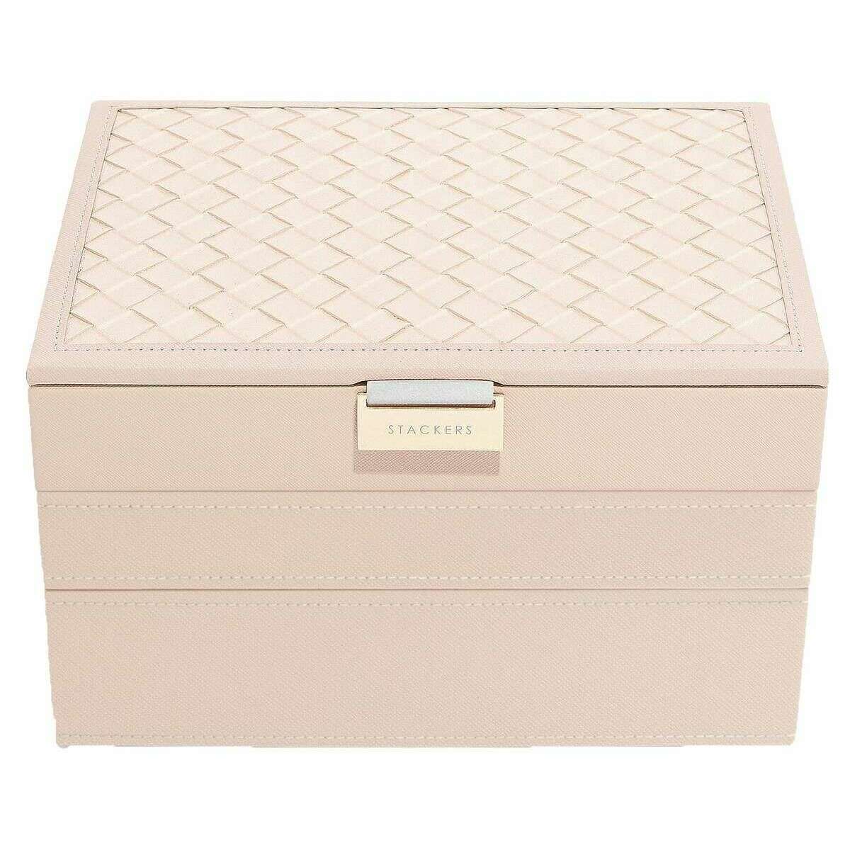 Utilizzando ecopelle rosa e velluto, questo classico set di 3 portagioielli di Stackers è perfetto per le donne e un must have. Misura 13,7 cm (altezza) x 25 cm (larghezza) x 18 cm (profondità). Tutti gli astucci per gioielli sono completi di confezione impilabile. Il set classico di 3 portagioie Stackers - intrecciato rosa cipria presenta un esclusivo design del portagioie intrecciato rosa. Questo portagioielli è perfetto per riporre tutti i tuoi gioielli! Viene fornito completo di tre strati e sezioni di diverse dimensioni per orecchini, anelli e bracciali e una sezione più ampia per orologi e braccialetti.