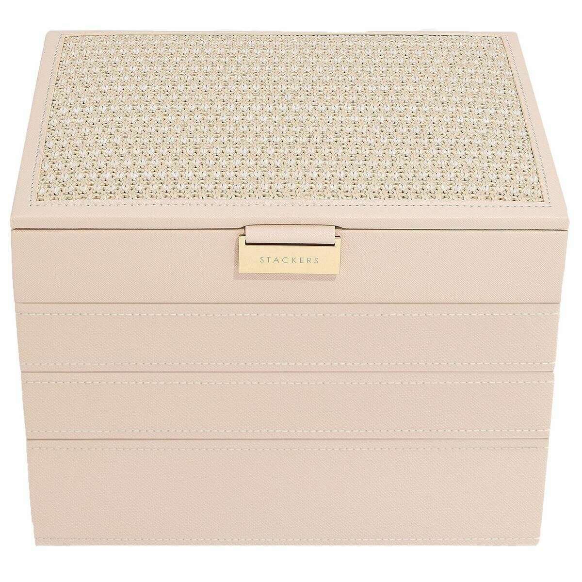 Questo classico set da 4 portagioielli da donna è stato realizzato in ecopelle e velluto, presentato in un colore rosa ed è della marca Stackers. Misura 19,5 cm (altezza) x 25 cm (larghezza) x 18 cm (profondità). Tutti gli astucci per gioielli sono completi di confezione impilabile. Il set classico di 4 portagioie Stackers - Rafia rosa cipria presenta un esclusivo design del portagioie in rafia rosa. Questo portagioielli è perfetto per riporre tutti i tuoi gioielli! Viene fornito completo di quattro strati e sezioni di diverse dimensioni per orecchini, anelli e bracciali e una sezione più ampia per orologi e braccialetti.