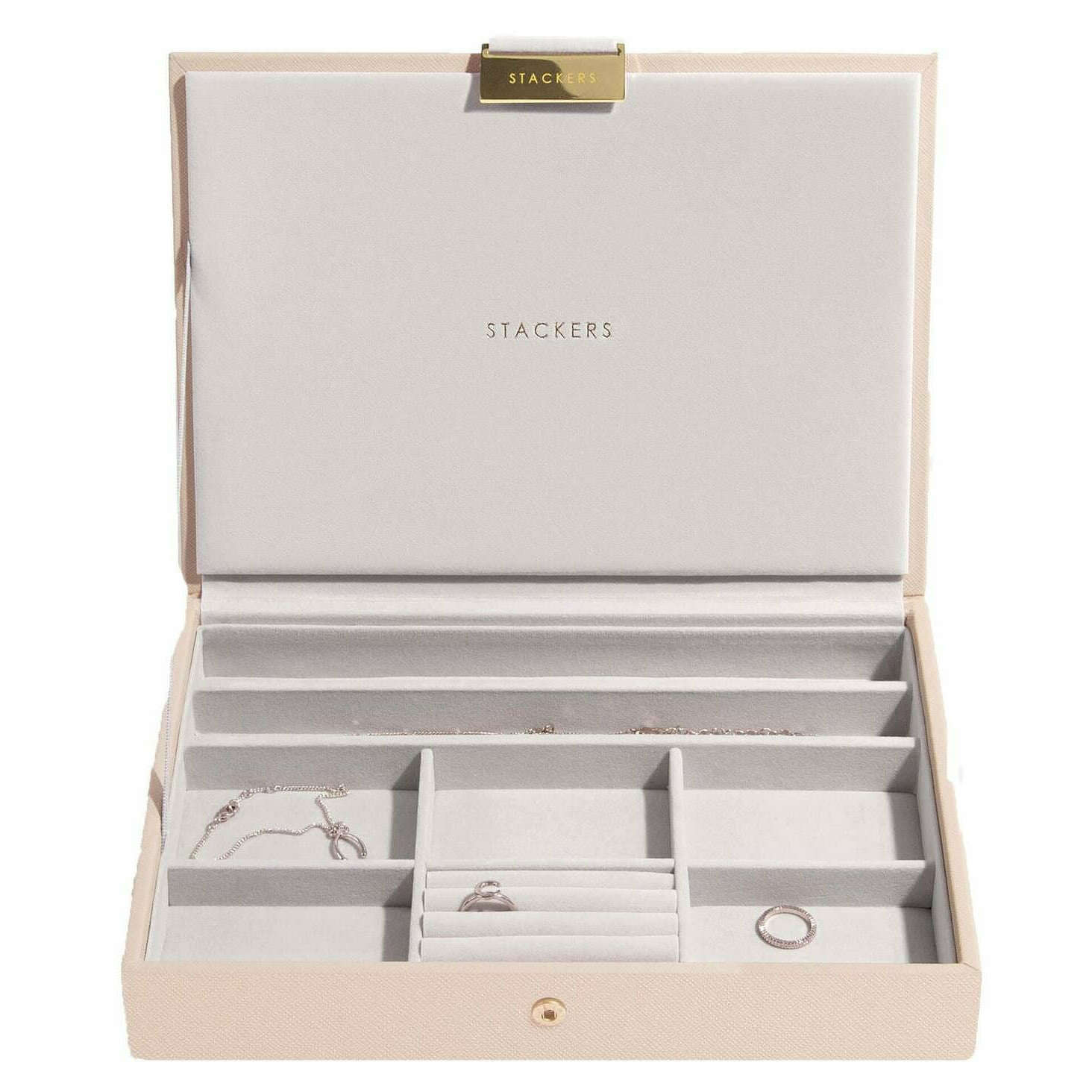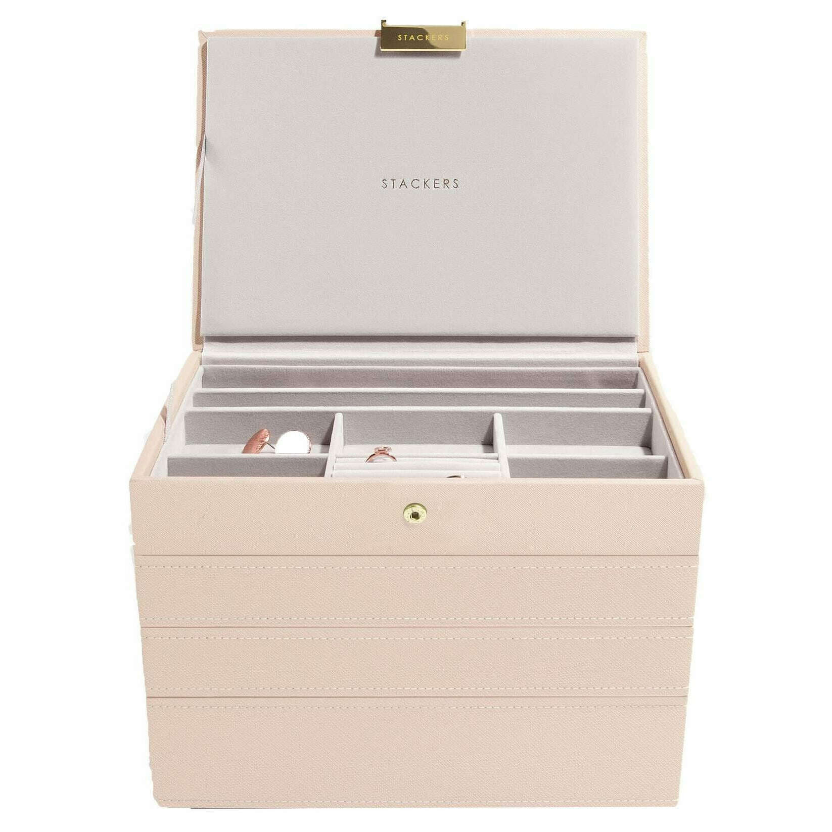 Questo classico set da 4 portagioie da donna del marchio Stackers è realizzato in ecopelle e velluto ed è presentato in rosa. Misura 19,5 cm (altezza) x 25 cm (larghezza) x 18 cm (profondità). Tutti gli astucci per gioielli sono completi di confezione impilabile. Il set classico di 4 portagioielli Stackers - intrecciato rosa cipria presenta un design unico di portagioie intrecciato rosa. Questo portagioielli è perfetto per riporre tutti i tuoi gioielli! Viene fornito completo di quattro strati e sezioni di diverse dimensioni per orecchini, anelli e bracciali e una sezione più ampia per orologi e braccialetti.