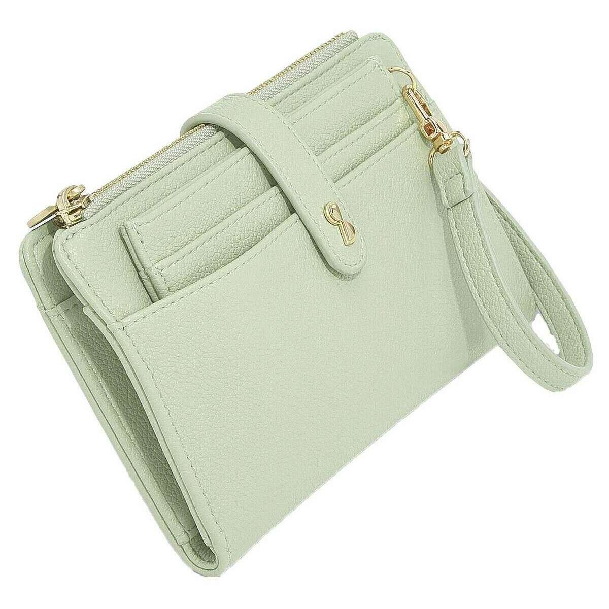 • Tasca esterna per telefono, 6 scomparti per carte, specchio cosmetico, tasca portamonete con cerniera rimovibile, cinturino da polso rimovibile, chiusura con bottoni automatici