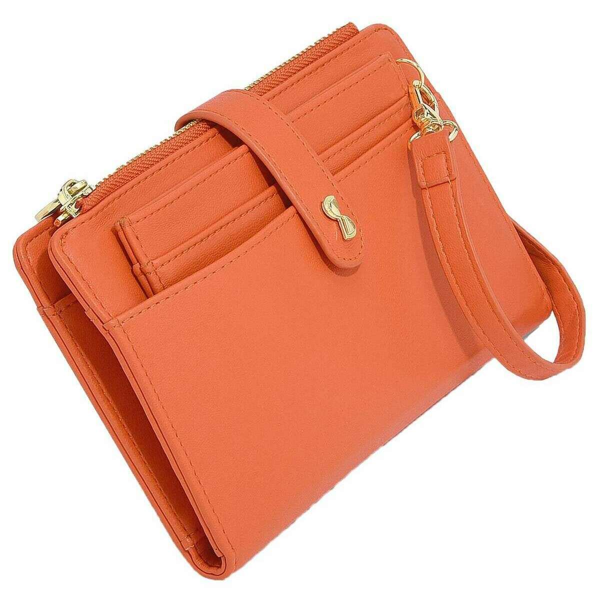 • Tasca esterna per telefono, 6 scomparti per carte, specchio cosmetico, tasca portamonete con cerniera rimovibile, cinturino da polso rimovibile, chiusura con bottoni automatici