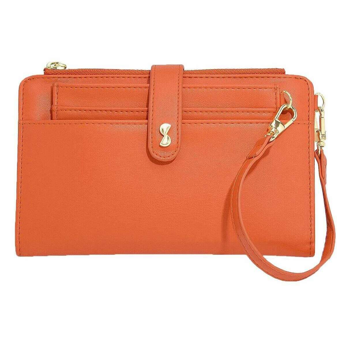 Realizzata in ecopelle è la grande borsa da donna arancione del designer Stackers. Misura 12,5 cm (altezza) x 19,5 cm (larghezza) x 3 cm (profondità). Tutte le borse sono complete di confezione impilabile. La borsa grande Stackers - Arancione è un must quando sei in movimento! Questo portamonete arancione classico e trendy è dotato di molteplici tasche per soldi e carte, un portamonete rimovibile e uno specchio cosmetico. Viene fornito completo di cinturino da polso rimovibile e tasca esterna per telefono. Perfetto per qualsiasi uscita!