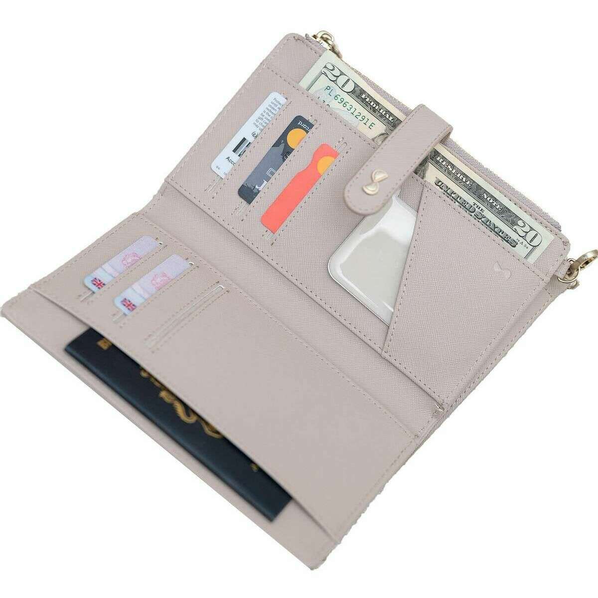 • Tasca esterna per telefono, 6 scomparti per carte, specchio cosmetico, tasca portamonete con cerniera rimovibile, cinturino da polso rimovibile, chiusura con bottoni automatici