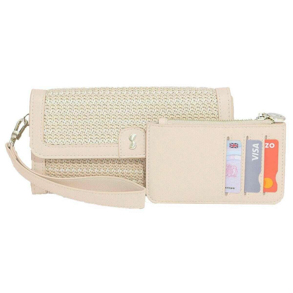 Utilizzando l'effetto rafia rosa e l'ecopelle, questa borsa in rafia di Stackers è perfetta per le donne e un must. Tutte le borse sono complete di confezione impilabile. La borsa in rafia Stackers - Rafia rosa cipria è un must quando sei in movimento! Questo portamonete in rafia rosa, unico e alla moda, è dotato di molteplici tasche per soldi o carte, un portamonete rimovibile e uno specchio cosmetico. Viene fornito completo di cinturino da polso rimovibile per diversi usi.
