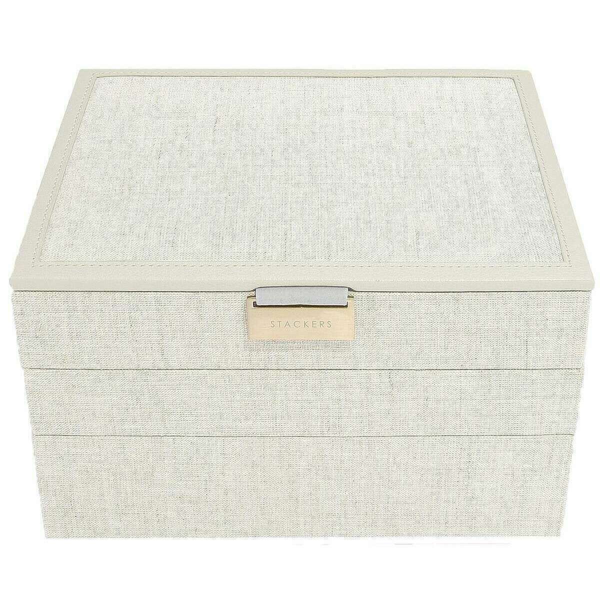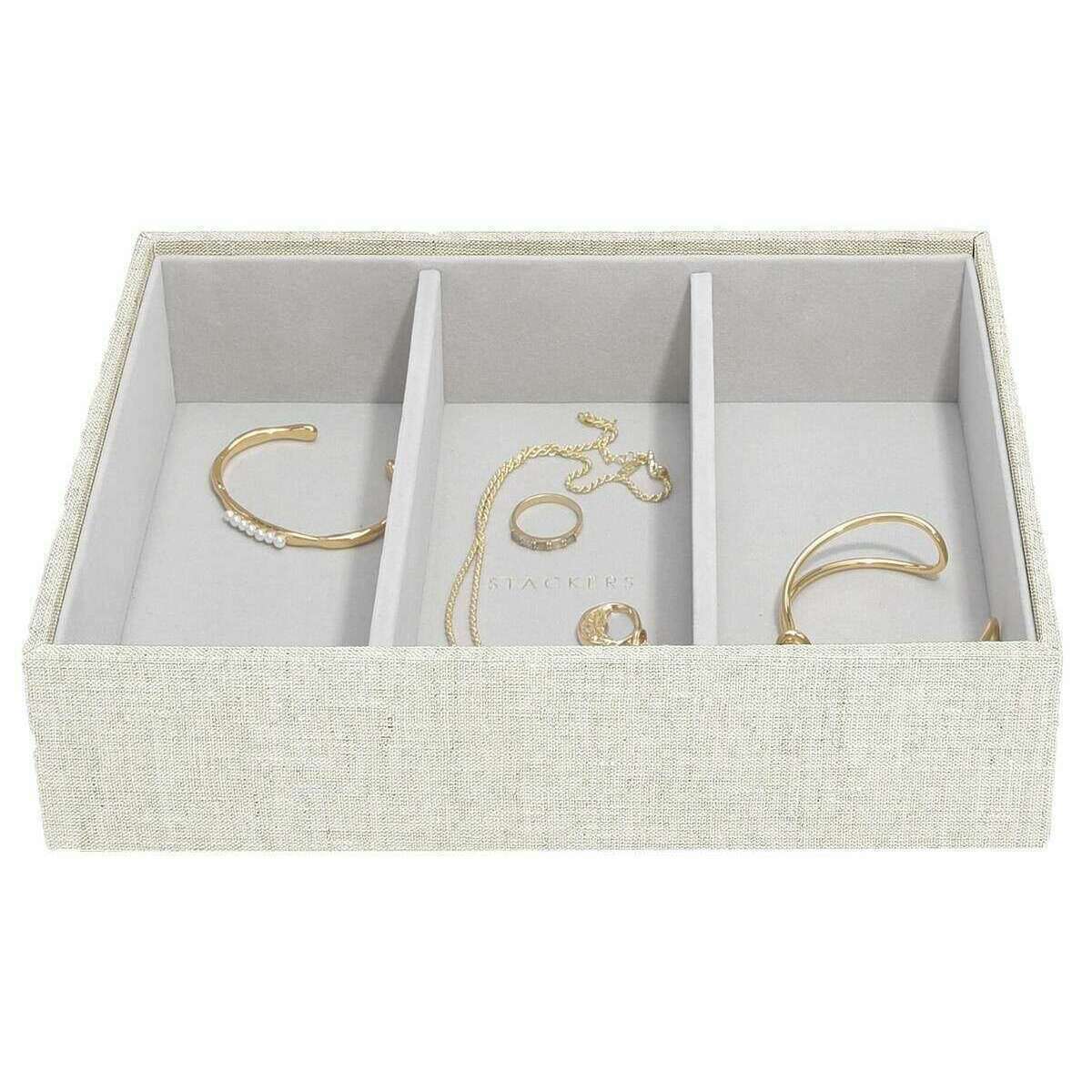 Questo set femminile ben fatto di 3 classici gioielli di gioielli di Stackers è disponibile in un colore beige di farina d'avena/lino ed è prodotto in pelle finta e lino. Misura 14,7 cm (altezza) x 25 cm (larghezza) x 18 cm (profondità). Tutte le scatole di gioielli sono complete nella confezione di Stacker. Il set di stackers di 3 classici gioielli di gioielleria: farina d'avena/lino sarà certo di impressionare con la sua incredibile quantità di spazio. Con una sezione coperta superiore per quei preziosi piccoli pezzi, il mezzo è un vassoio di 25 sezioni per quei fasi o anelli, e quindi il fondo è una scatola a tre sezioni profonde per quegli oggetti più grandi come grandi braccialetti, orologi e occhiali da sole. Rendi questa la scatola di gioielli più ideale che puoi possedere con esso offrendo così tanto nel modo più lussuoso.