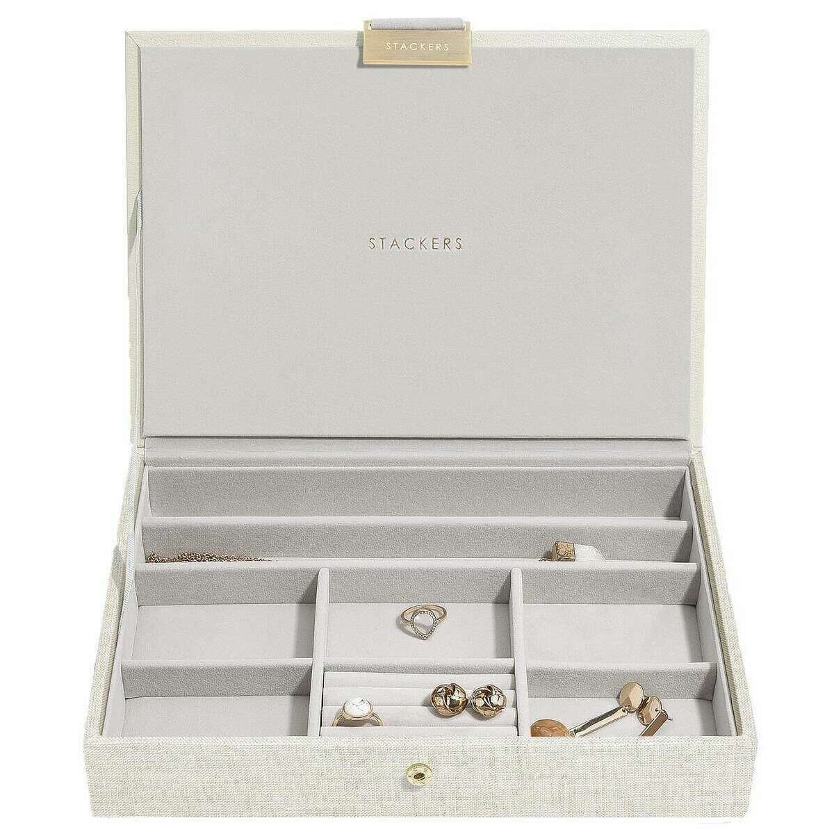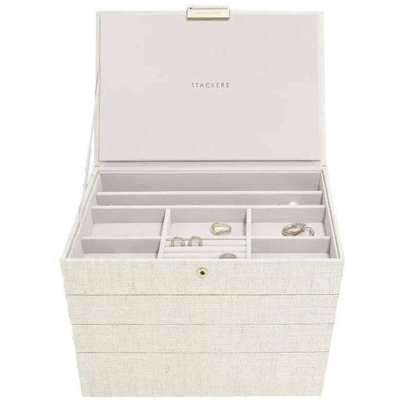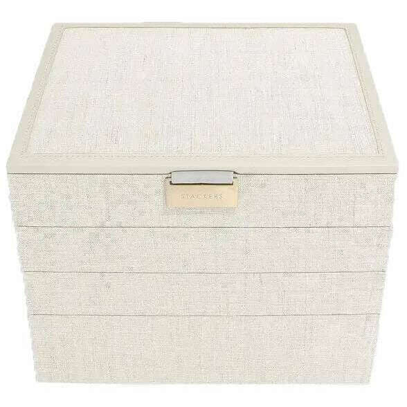 Designer Stackers ti ha portato a questa scatola di gioielli in pelle e lino di lino da donna con toni di beige di farina d'avena/lino. Misura 18,2 cm (altezza) x 25 cm (larghezza) x 18 cm (profondità). Tutte le scatole di gioielli sono complete nella confezione di Stacker. Il set di stackers di 4 classici gioielli di gioielleria - farina d'avena/lino sarà certo di impressionare con la sua incredibile quantità di spazio. Con una sezione coperta superiore per quei preziosi piccoli pezzi, un vassoio di sezione a 25 sezioni per quei fasi o anelli, un altro vassoio centrale con tre sezioni per contenere i braccialetti e le collane con rotoli ad anello per conservare più anelli e orecchini, e quindi il fondo è una scatola a tre sezioni profonde per quei oggetti più grandi come grandi braccialetti, orologi e occhiali da sole. Rendi questa la scatola di gioielli più ideale che puoi possedere con esso offrendo così tanto nel modo più lussuoso.