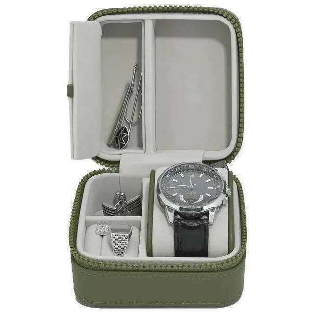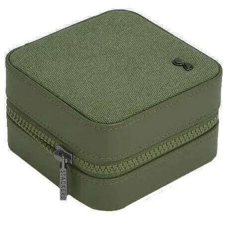 Designer Stackers ti ha portato a questa scatola da uomo in pelle e tela da uomo con toni verdi. Misura 11 cm (altezza) x 11 cm (larghezza) x 7 cm (profondità). Tutte le scatole dei gentiluomini sono complete nella confezione di Stacker. The Stackers Square Travel Watch and Jewellery Box - Ideale verde per qualsiasi gentiluomo che cerca un modo intelligente e di classe per mantenere l'orologio e i piccoli gioielli organizzati e sicuri. Con un rotolo di orologio imbottito per mantenere l'orologio libero da graffi, un rotolo ad anello per anelli o orecchini, un piccolo vano profondo per oggetti sciolti come gemelli e il coperchio con un vano per porte per qualsiasi oggetto extra sciolto. La chiusura della cerniera garantisce la sicurezza quando si viaggia o si appoggiano sul tavolo laterale o sulla scrivania.
