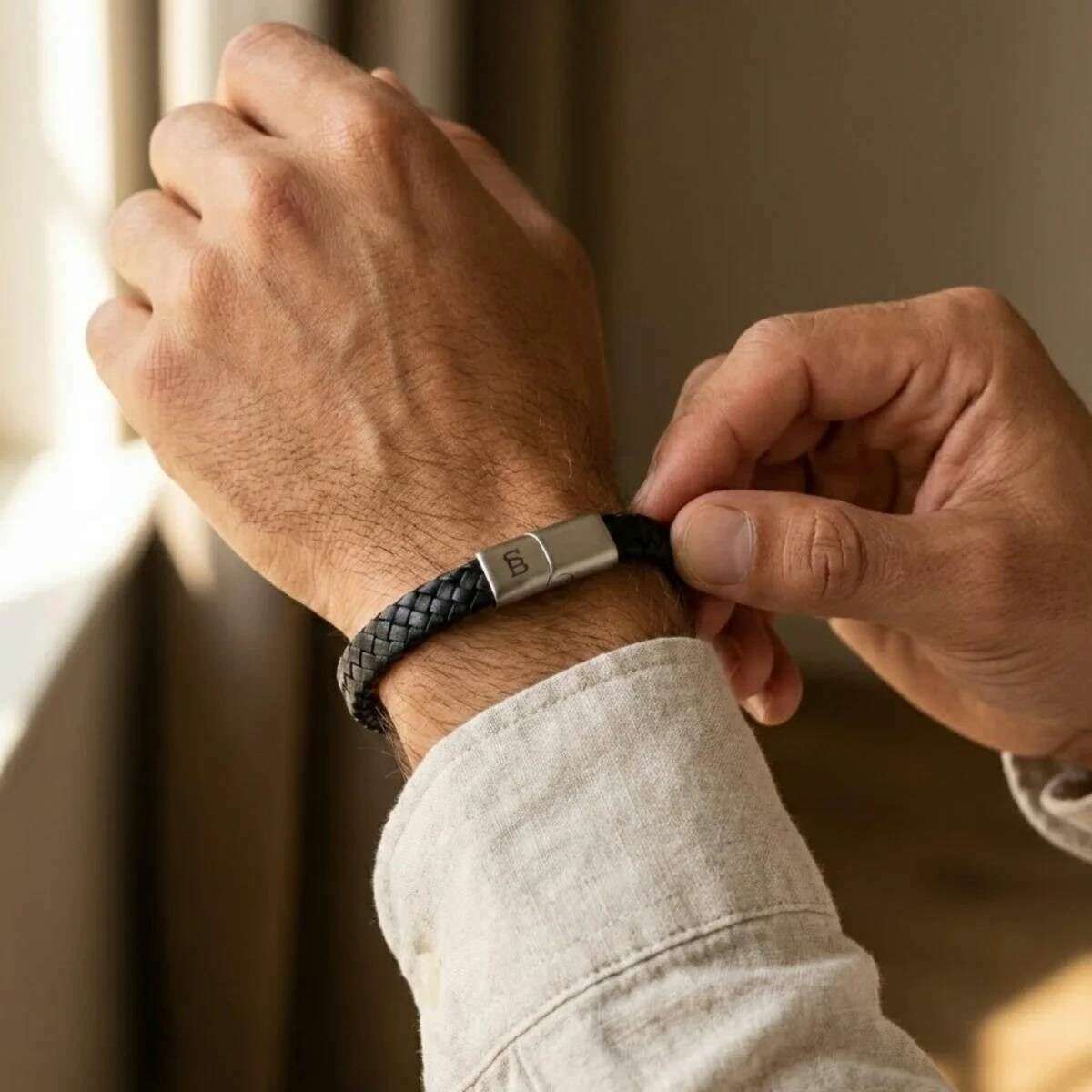 Questo elegante bracciale da uomo in pelle intrecciata Riley del marchio Steel & Barnett è realizzato al 100% in pelle di vacchetta e acciaio inossidabile ed è presentato in nero. Tutti i bracciali sono completi di confezione in acciaio e barnett. Il bracciale Steel & Barnett Riley Sleek Braided Leather - Nero è realizzato per incarnare forza e affidabilità, offrendo un accessorio raffinato adatto a qualsiasi collezione. Realizzato al 100% in vera pelle di vacchetta, il suo profilo sottile di 6 mm presenta un design elegantemente intrecciato che offre una raffinata raffinatezza senza sacrificare la durata. Una chiusura in acciaio spazzolato, realizzata in acciaio inossidabile 316L, offre un'eccezionale resistenza all'usura e alla corrosione, mentre la sua chiusura magnetica garantisce una vestibilità sicura e confortevole attorno al polso. Progettato con cura ed elegante senza sforzo, questo braccialetto è la scelta ideale per chi cerca un accessorio in pelle minimalista ma distinto che valorizza l'abbigliamento quotidiano con sobria eleganza.