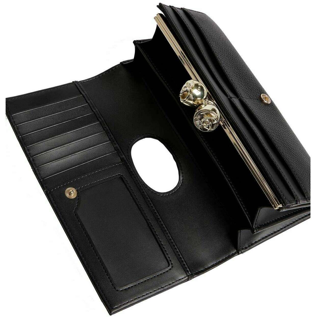 • Patta frontale con chiusura a bottone automatico, scomparti multipli per carte e finestra identificativa, doppio scomparto per banconote, tasca con zip sul retro.