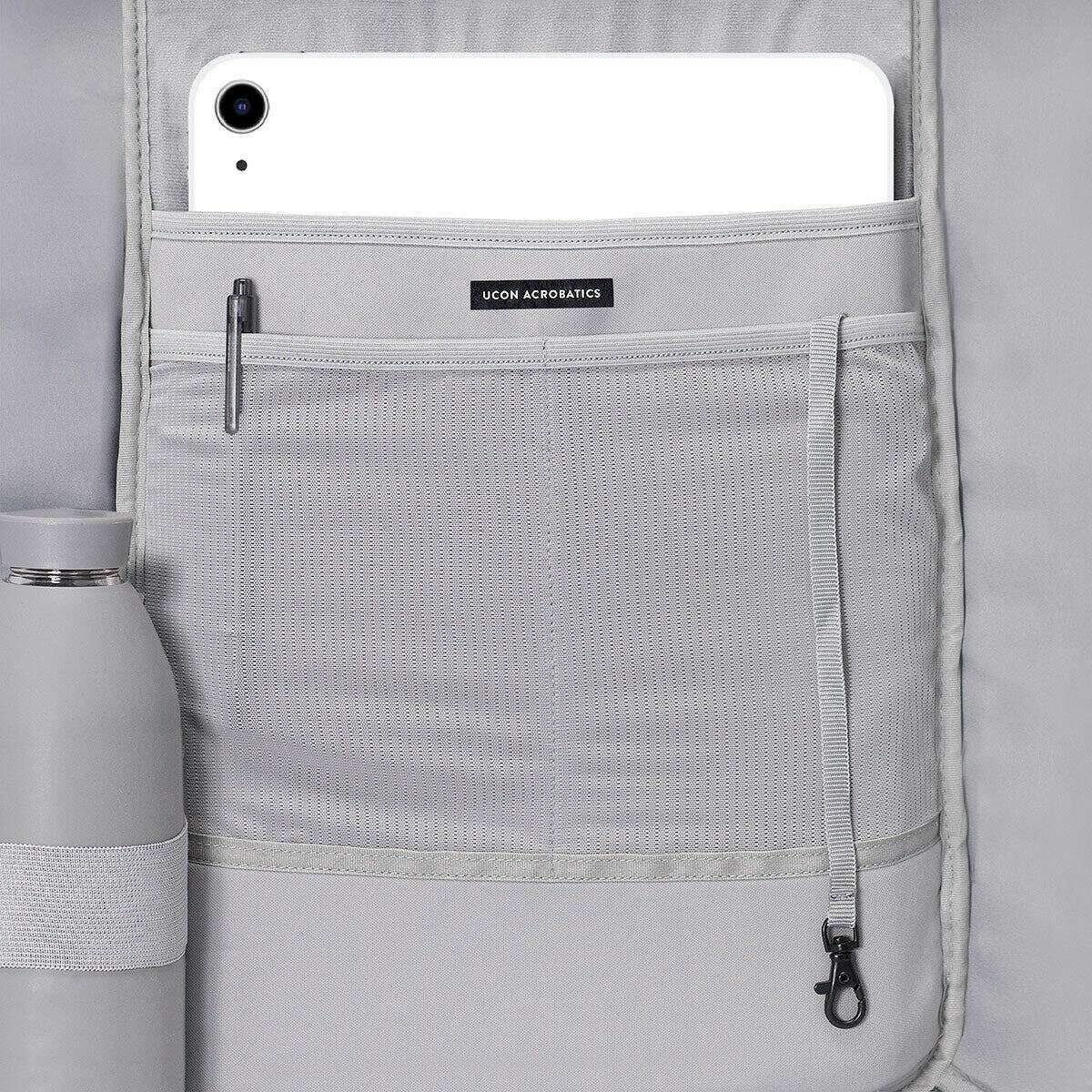 • La parte superiore arrotolabile per ridimensionare il volume può essere chiusa facilmente e rapidamente con chiusura a strappo, l'apertura principale si chiude inoltre con due bottoni a pressione, accesso rapido allo scomparto principale tramite cerniera verticale, due tasche esterne sui lati, una tasca esterna sul davanti si chiude con cerniera idrorepellente, scomparto interno in neoprene riciclato di alta qualità con ammortizzatore incorporato adatto a laptop o tablet da 16", portabottiglie elastico e portachiavi interno, rinforzato Schienale imbottito, spallacci imbottiti e regolabili, parte inferiore imbottita per maggiore sicurezza e stabilità, etichetta "Ucon Acrobatics" in rilievo sul davanti, impermeabile, vegano, capacità: 12 litri.